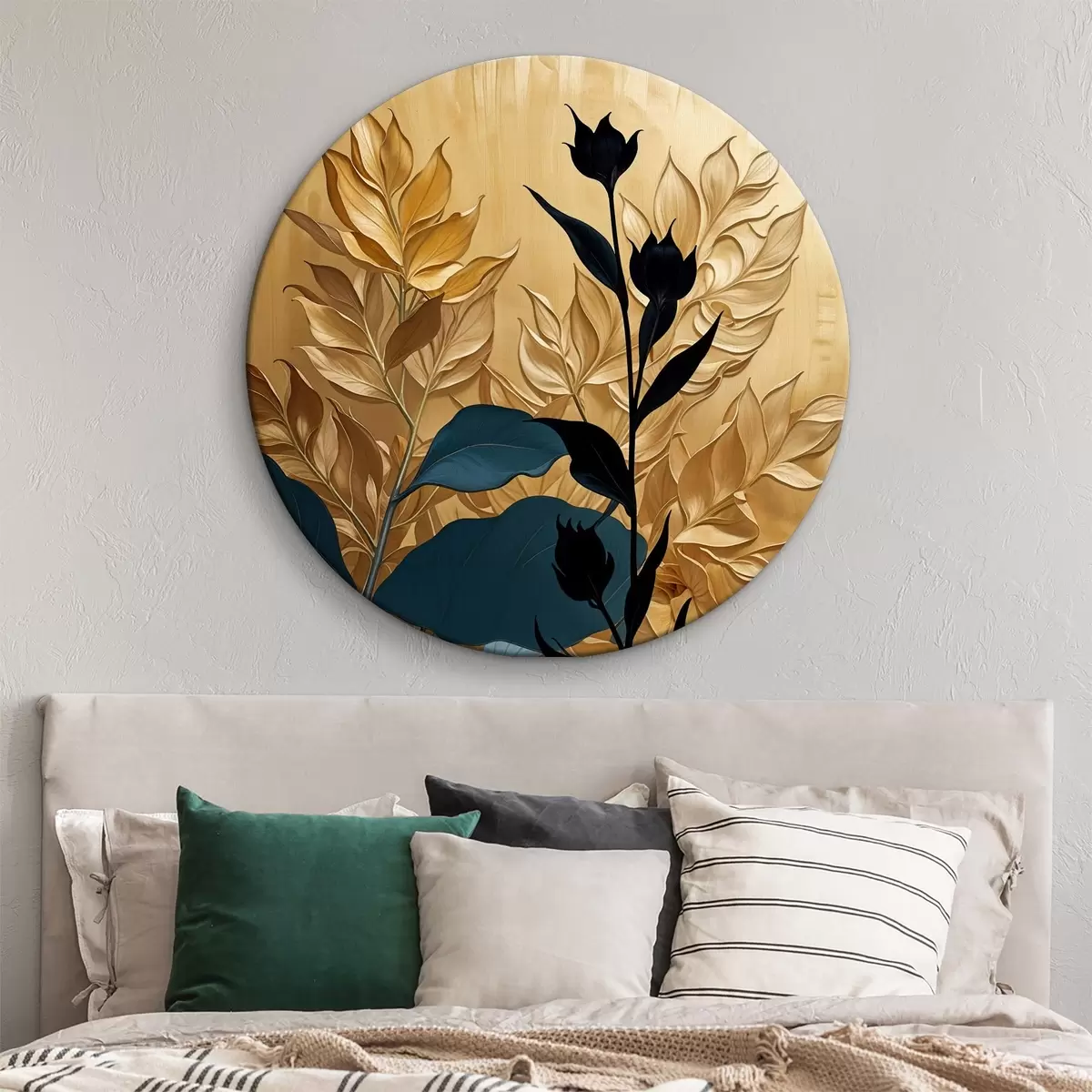 Tableaux rondes Composition florale abstraite comprenant de grandes feuilles et des silhouettes sombres Nr r38822