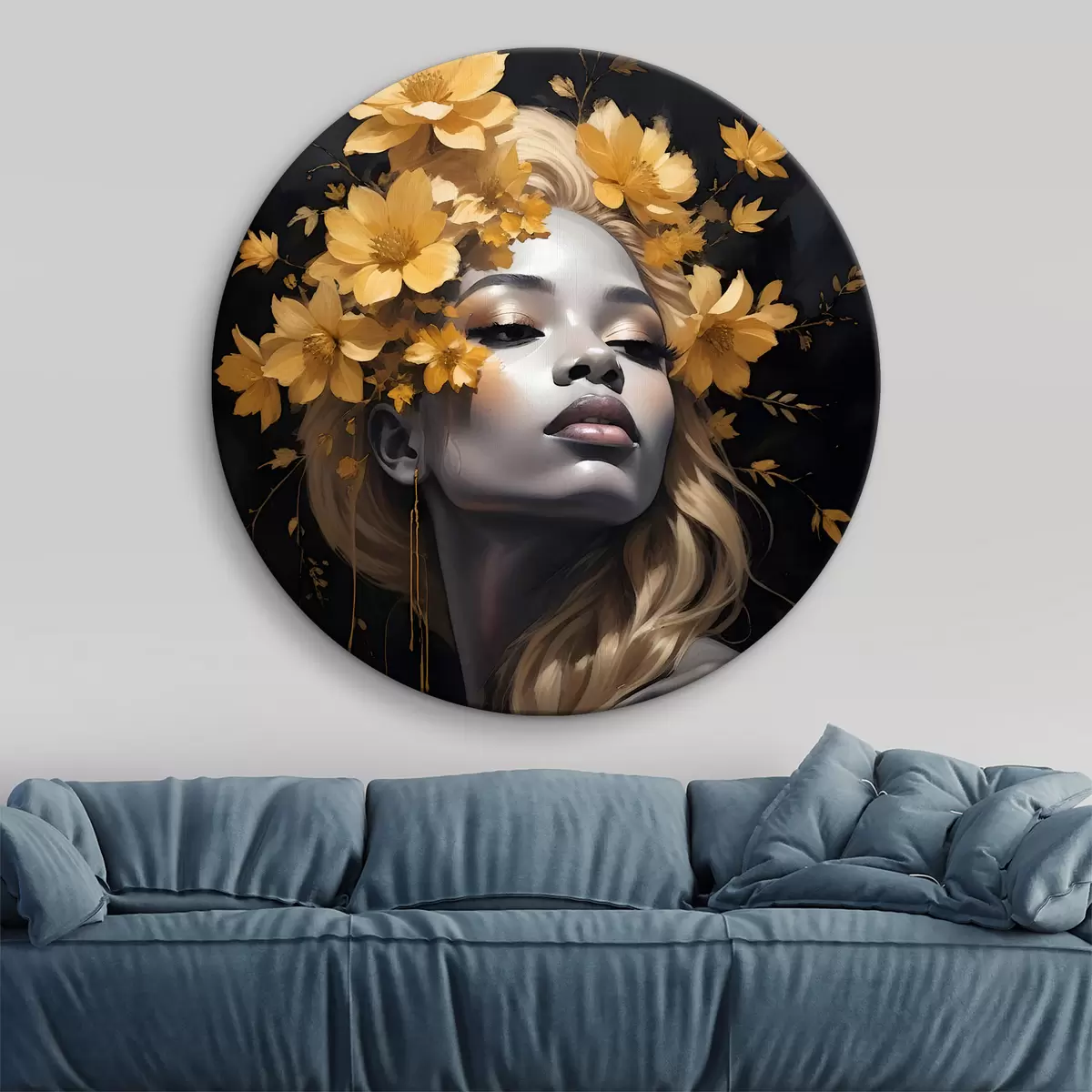 Tableaux rondes Portrait d'une jeune femme entourée de feuilles d'automne jaunes sur fond sombre Nr r38834