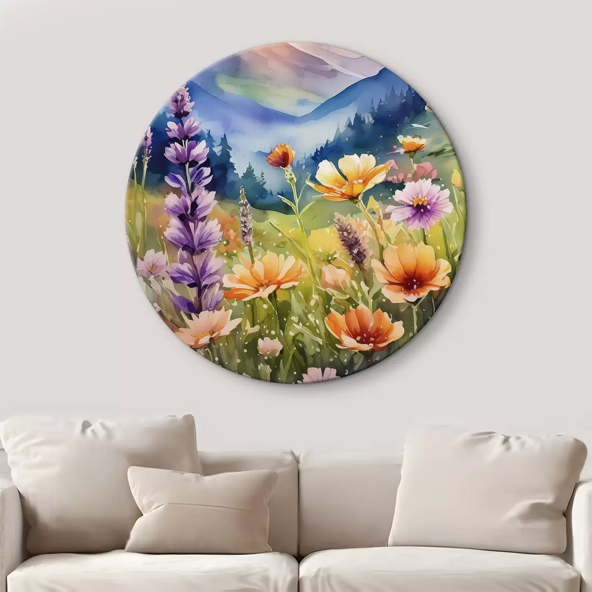 Tableaux rondes Paysage avec fleurs et montagnes Nr r38841