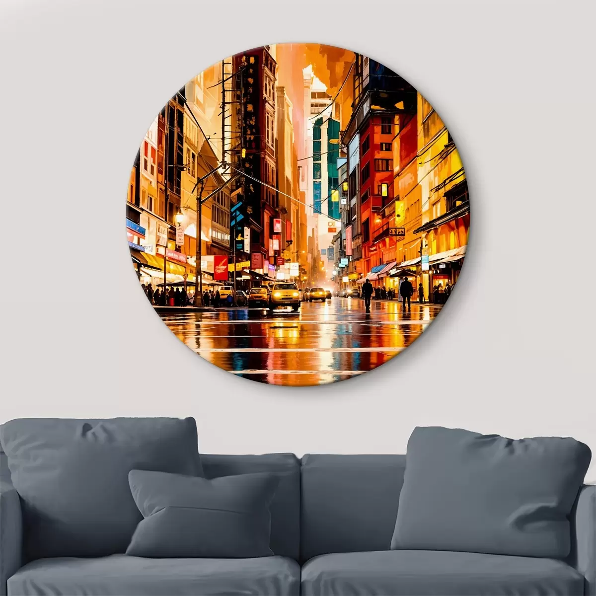 Tableaux rondes Peinture paysagère d'une rue de la ville la nuit avec de grands immeubles, des enseignes au néon et des taxis jaunes. r38897