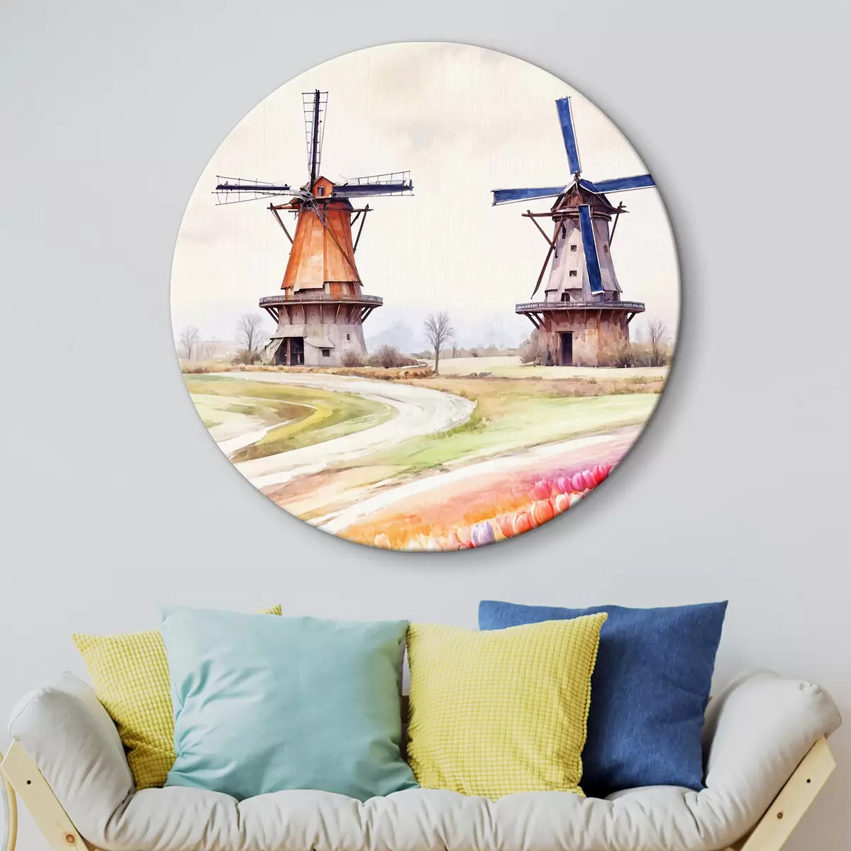 Tableaux rondes Moulins à vent dans un champ de tulipes r38904