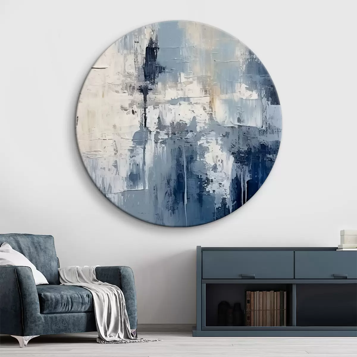 Tableaux rondes Peinture à l'huile abstraite minimaliste, frottée, géométrique, tache, couleur bleu et blanc Nr r38906
