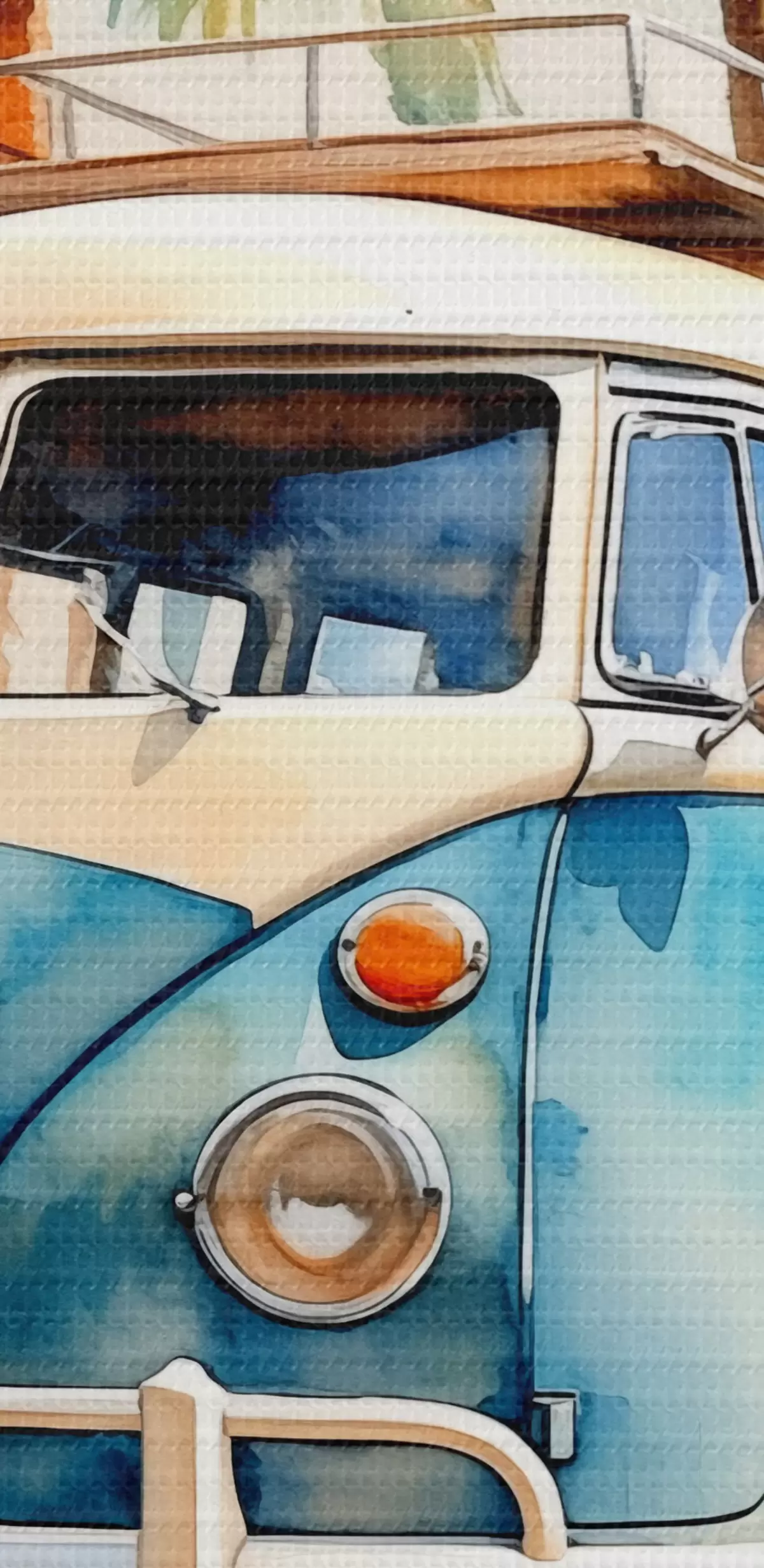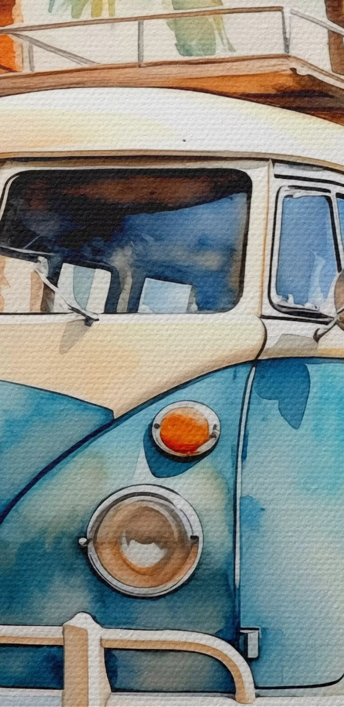 Tableaux rondes Une voiture de voyage est garée sur la plage sur fond d’aquarelle de palmiers r38911