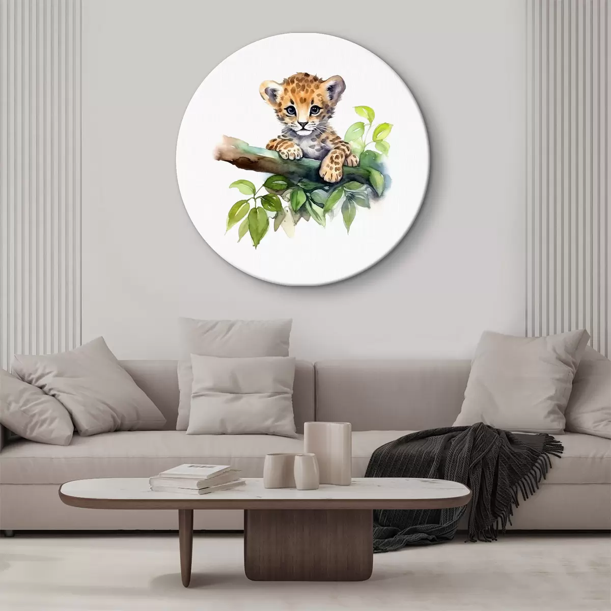 Tableaux rondes Petit léopard assis sur une branche avec des feuilles vertes, animal, aquarelle r38922