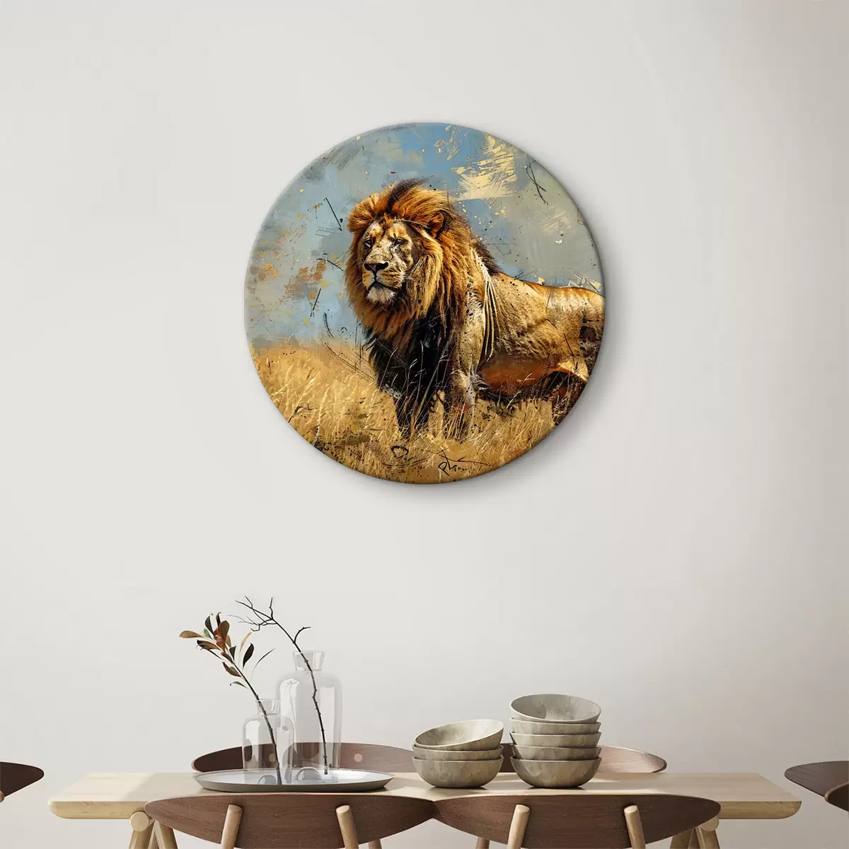 Tableaux rondes Un grand lion mâle avec une crinière épaisse et sombre, debout dans un champ herbeux sur fond de ciel nuageux Nr r38962