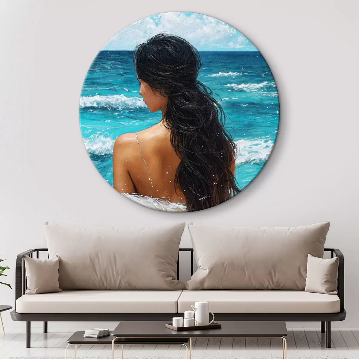 Tableaux rondes Une jeune femme debout devant un océan bleu vif avec des vagues déferlantes en arrière-plan Nr r38976