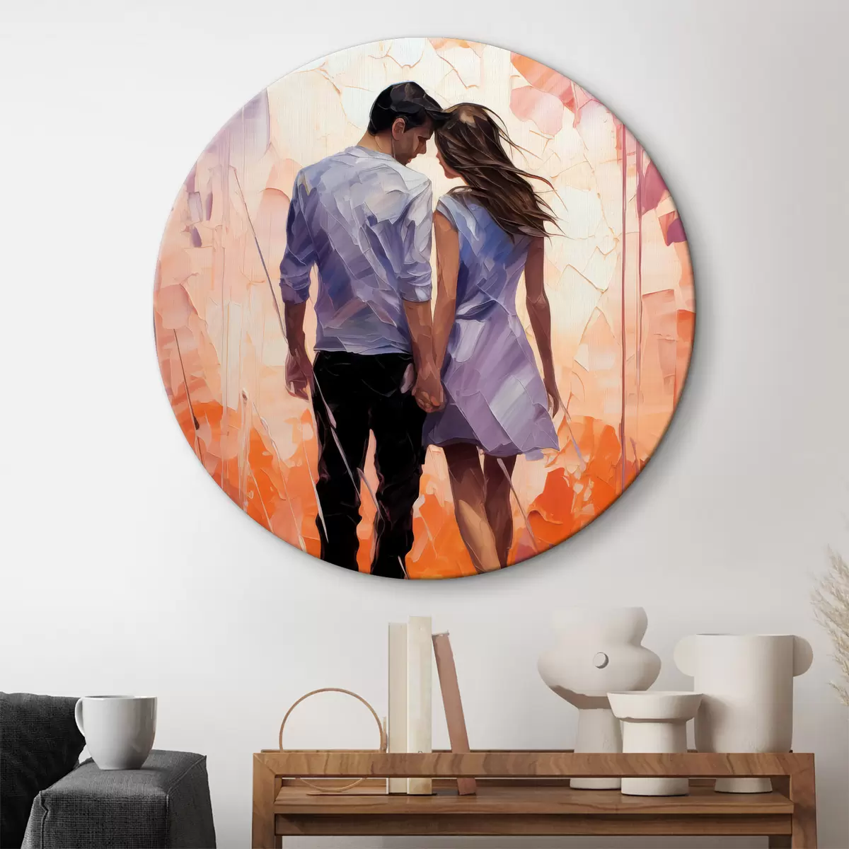 Tableaux rondes Silhouette d'un couple amoureux peinture abstraite, fille et gars, couleur rose, orange, violet, noir Nr r39124