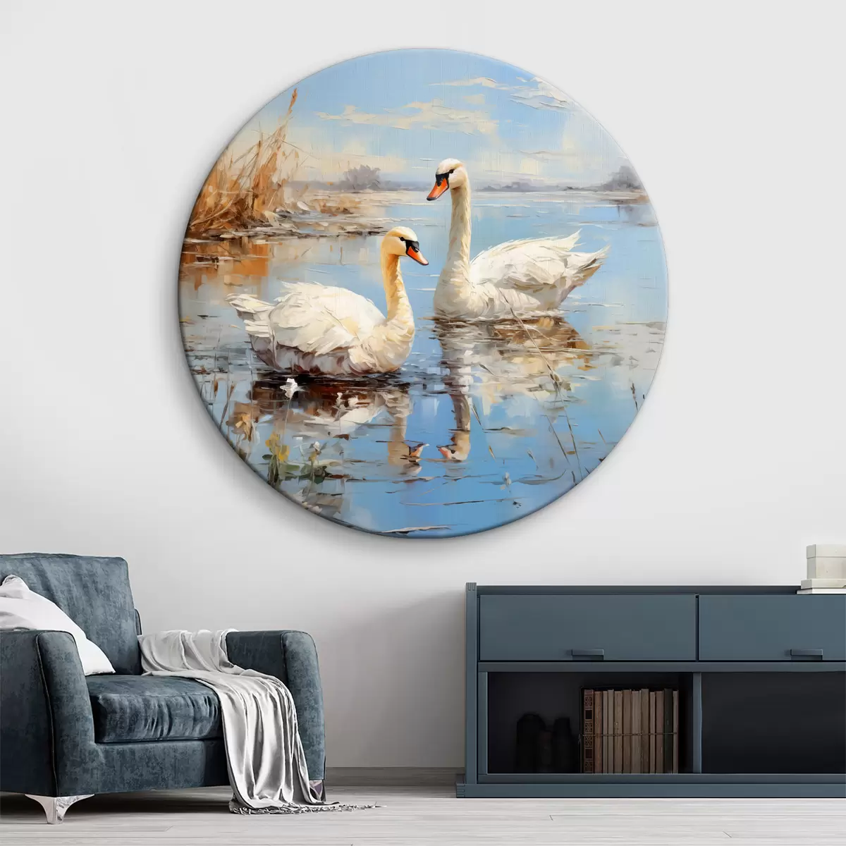 Tableaux rondes Les oies blanches nagent le long de la rivière parmi les roseaux, de couleur bleue, blanche et beige Nr r39130