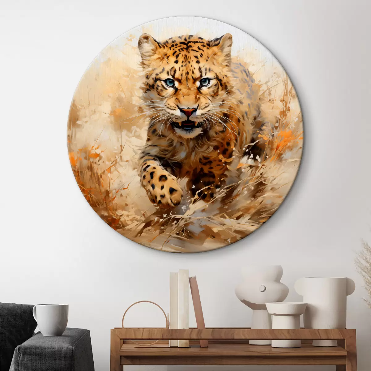 Tableaux rondes Un guépard aux yeux bleus et aux crocs se trouve dans l'art abstrait de peinture à l'huile d'herbe sèche Nr r39182