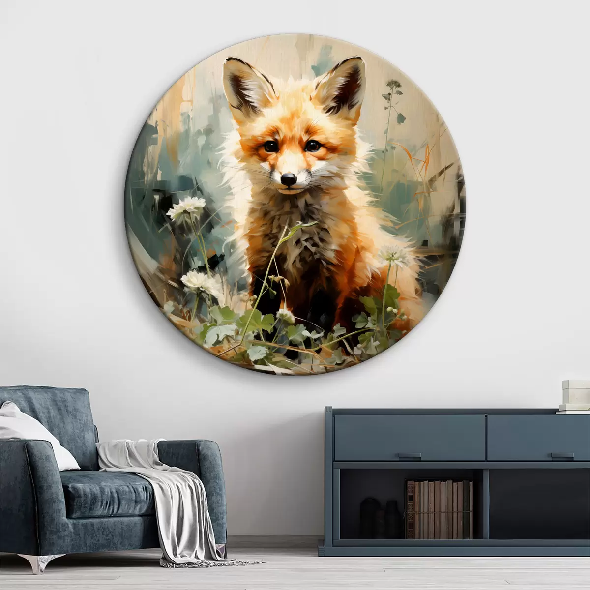 Tableaux rondes Renard roux assis dans l'herbe sèche sur une peinture à l'huile de fond vert r39191