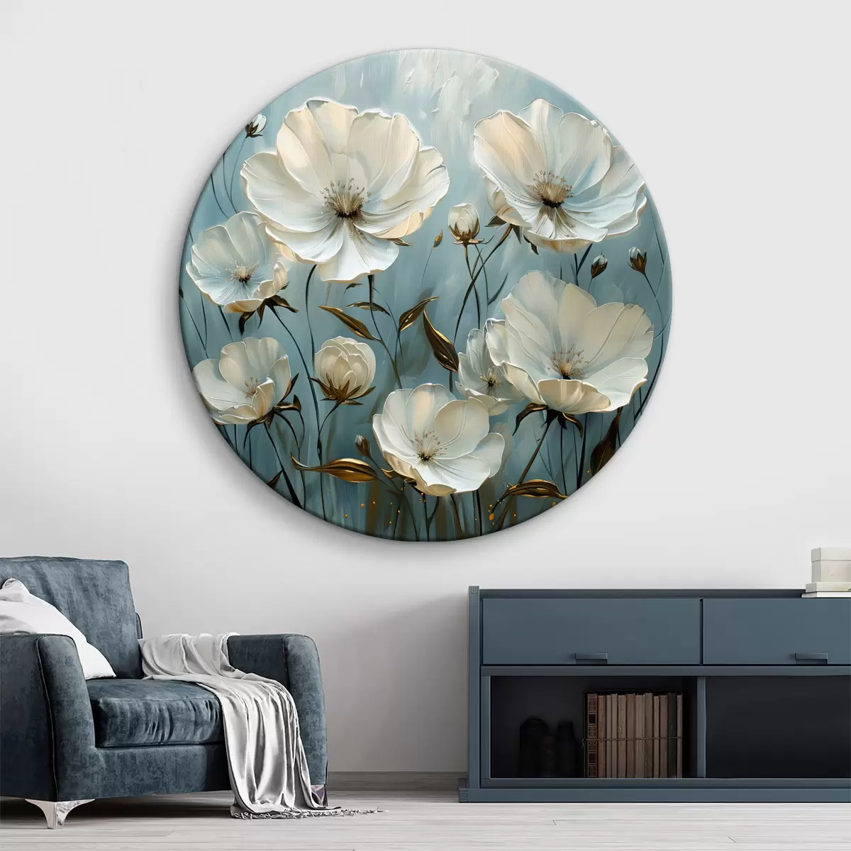 Tableaux rondes Fleurs blanches sur fond bleu Nr r39246