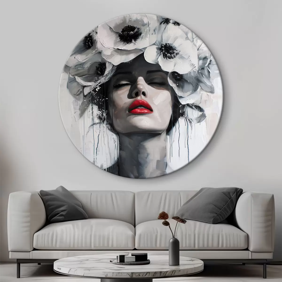 Tableaux rondes Portrait d'une femme avec des fleurs dans les cheveux et les lèvres rouges Nr r39253