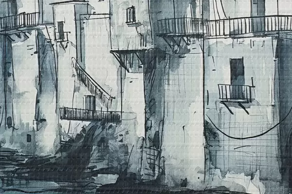 Tableaux rondes Croquis aquarelle de la ville sur l'eau en couleurs bleues r39323