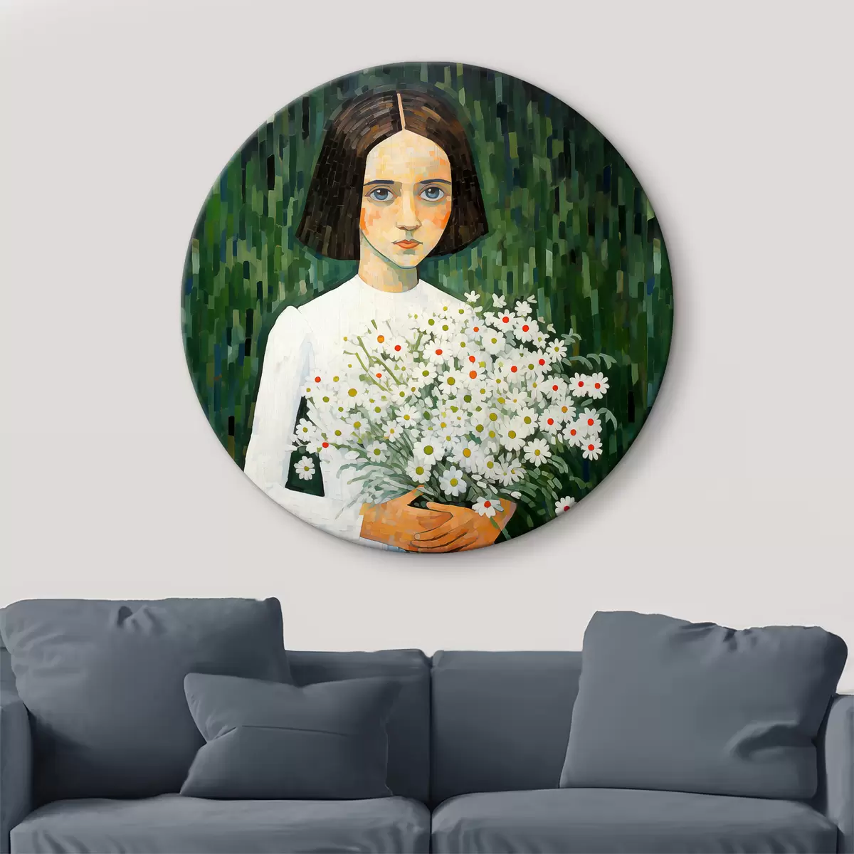 Tableaux rondes Une fille en robe blanche avec un bouquet de marguerites blanches dans ses mains sur fond vert Nr r39328