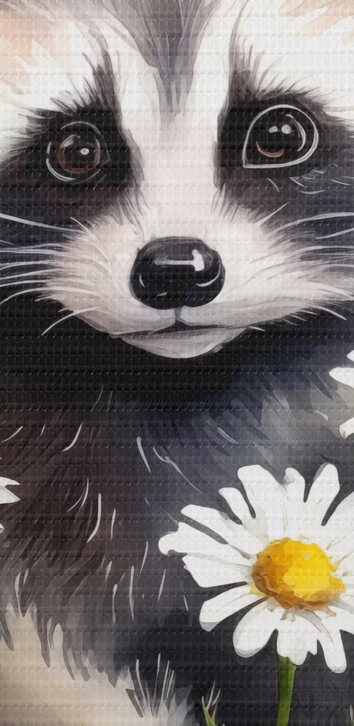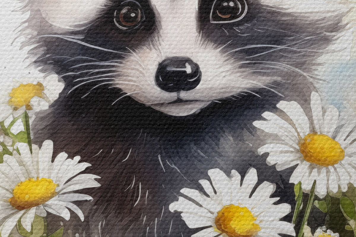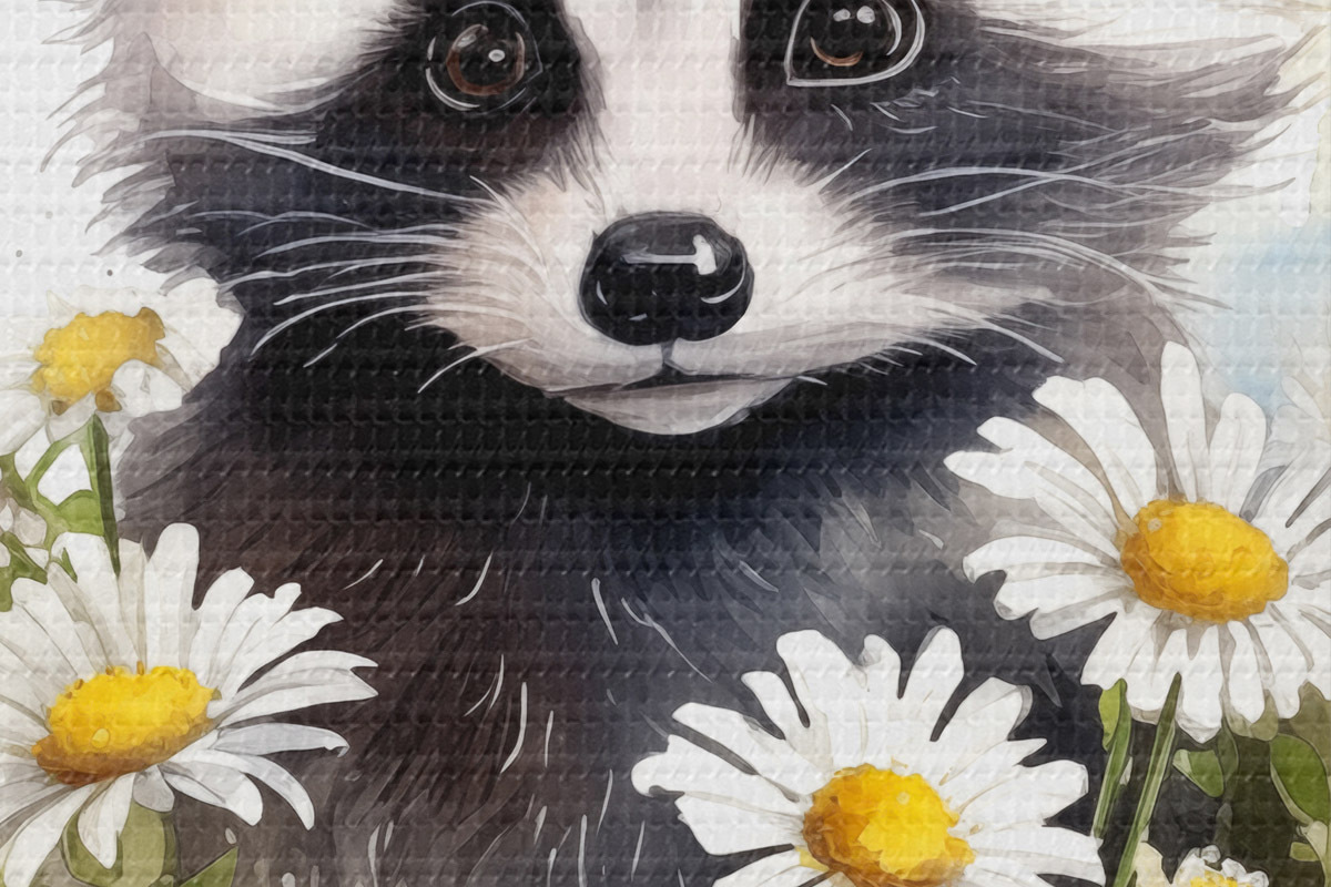 Tableaux rondes Petit raton laveur assis dans une illustration aquarelle de marguerites pour enfants Nr r39336
