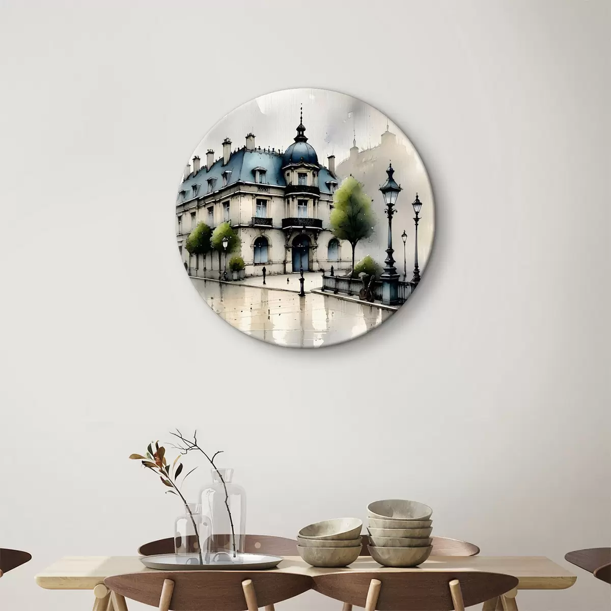 Tableaux rondes Un grand bâtiment d'aquarelle entouré de lampadaires et d'arbres, un jour de pluie Nr r39391