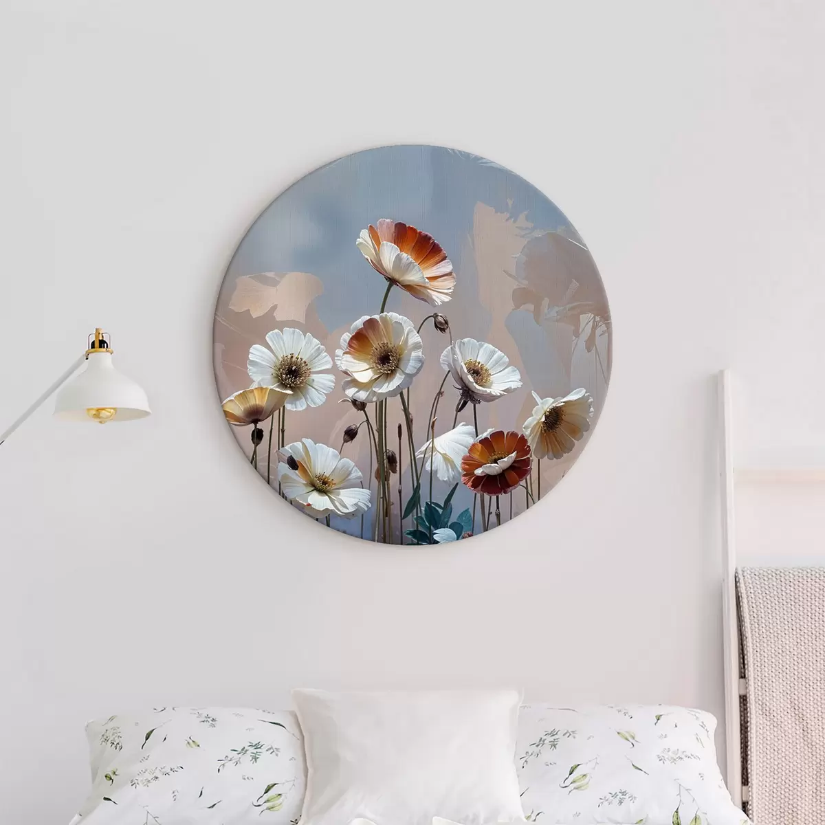 Tableaux rondes Un champ de fleurs de marguerites colorées avec des pétales blancs et des centres orange sur un arrière-plan doux et flou Nr r39396