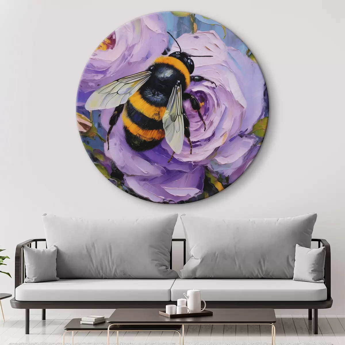 Tableaux rondes Abeille sur les pivoines roses, fleurs d'été, peinture à l'huile, coups de pinceau vifs r39410