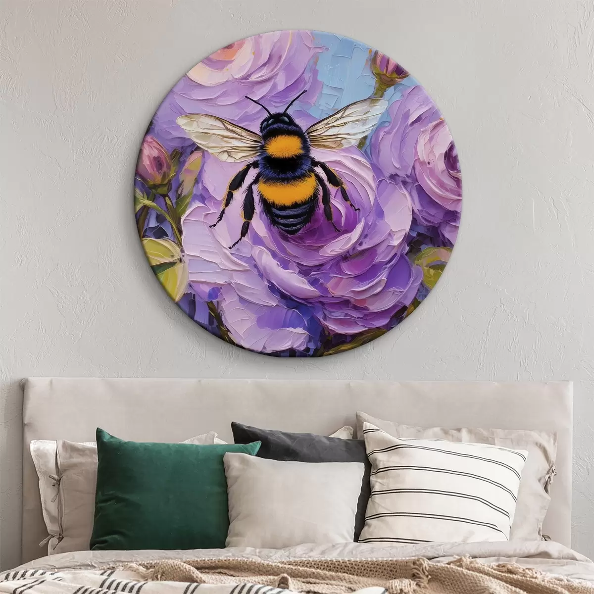 Tableaux rondes Abeille sur les pivoines roses, fleurs d'été colorées, peinture à l'huile, coups de pinceau vifs r39411