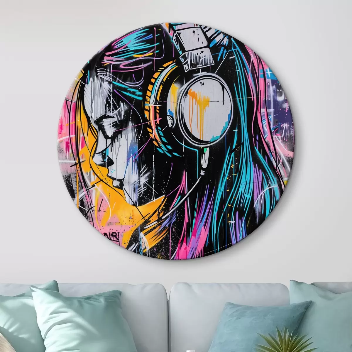 Tableaux rondes Femme avec des écouteurs dans un style graffiti Nr r39443