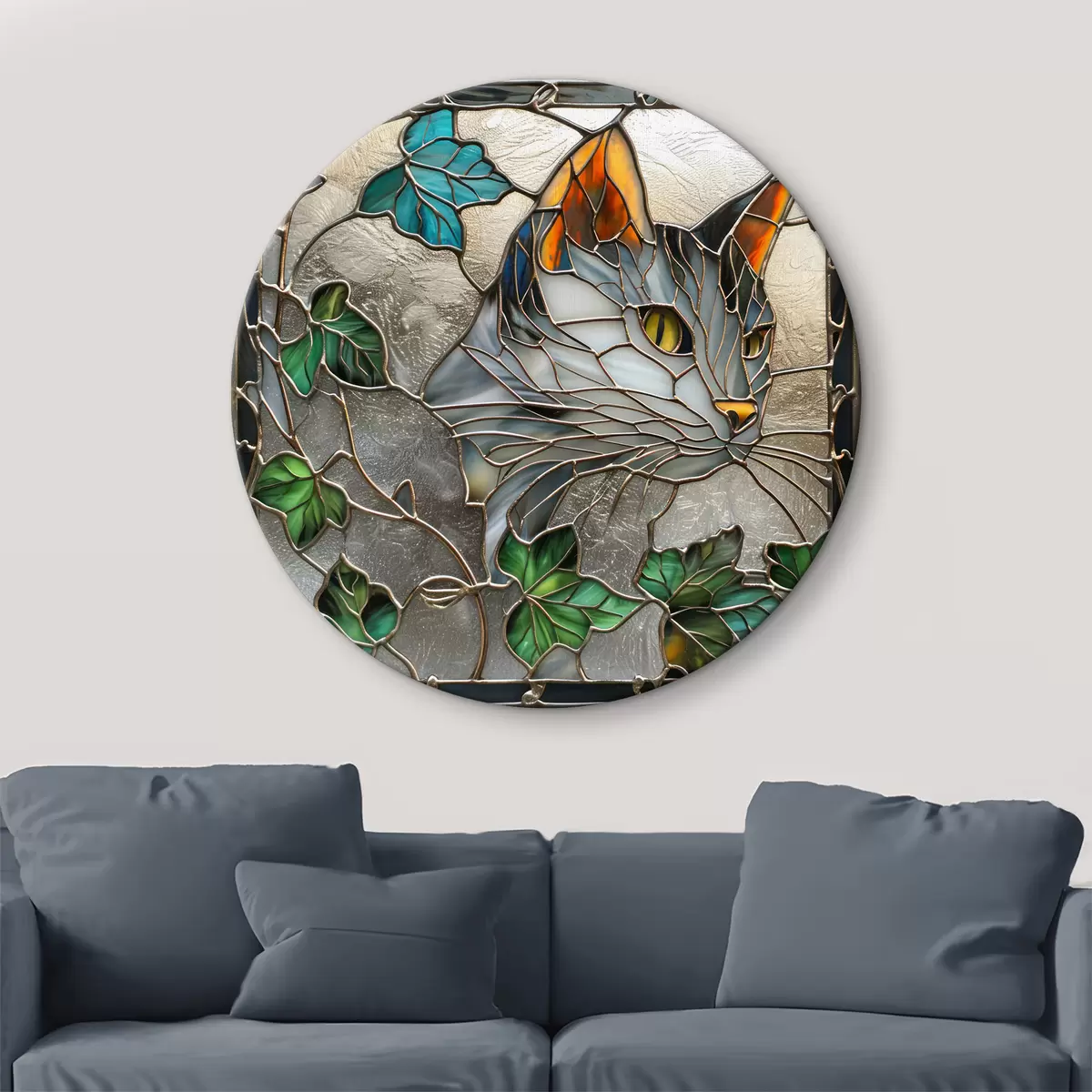 Tableaux rondes Oeuvre inspirée du vitrail : chat parmi les feuilles d'automne Nr r39448