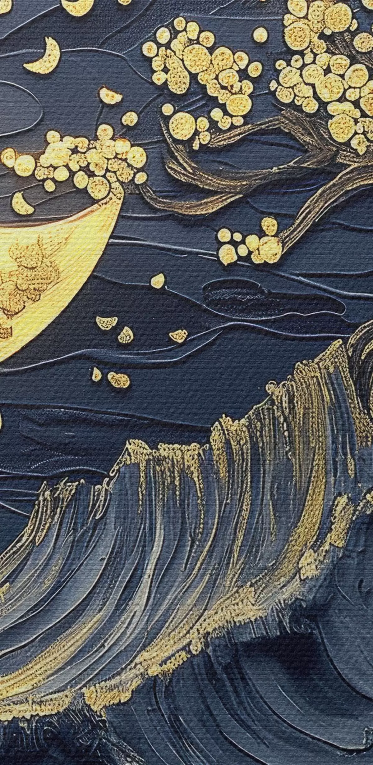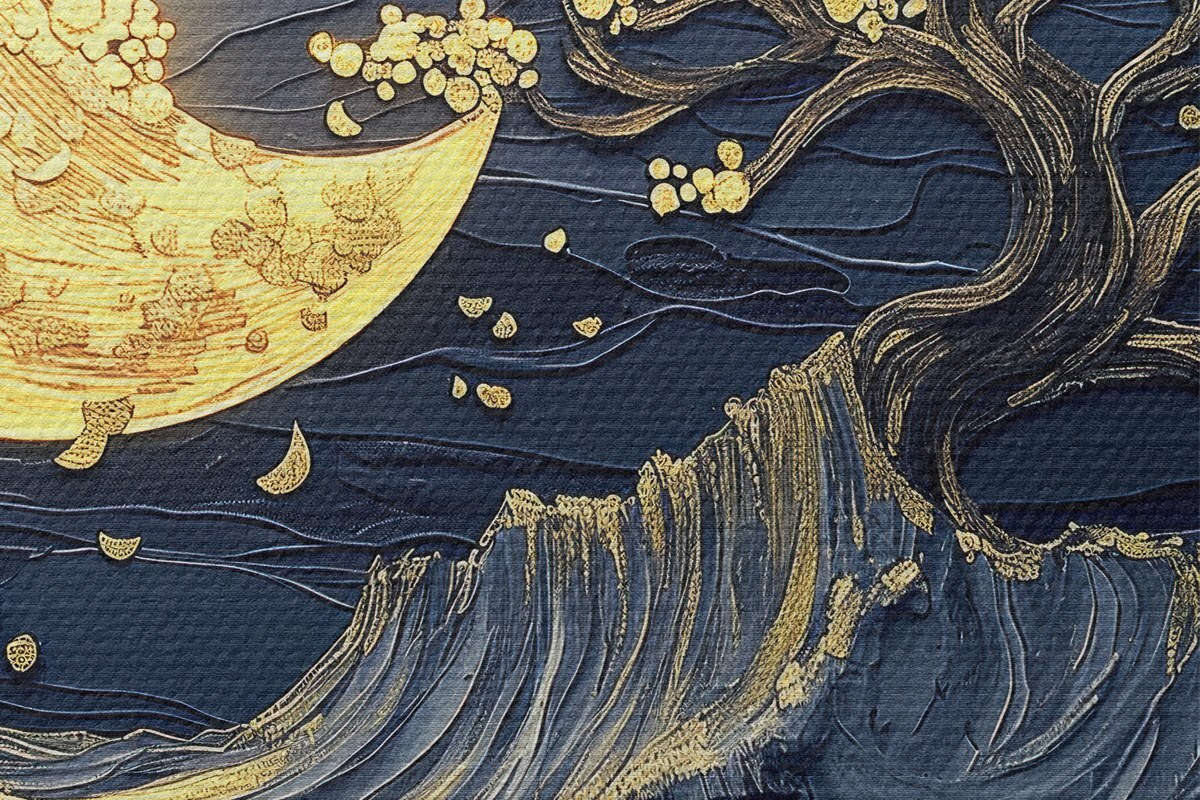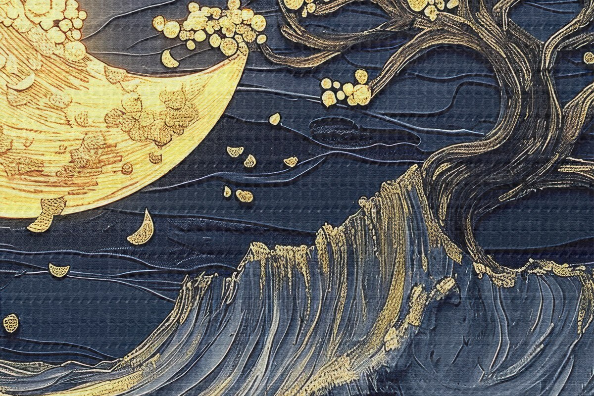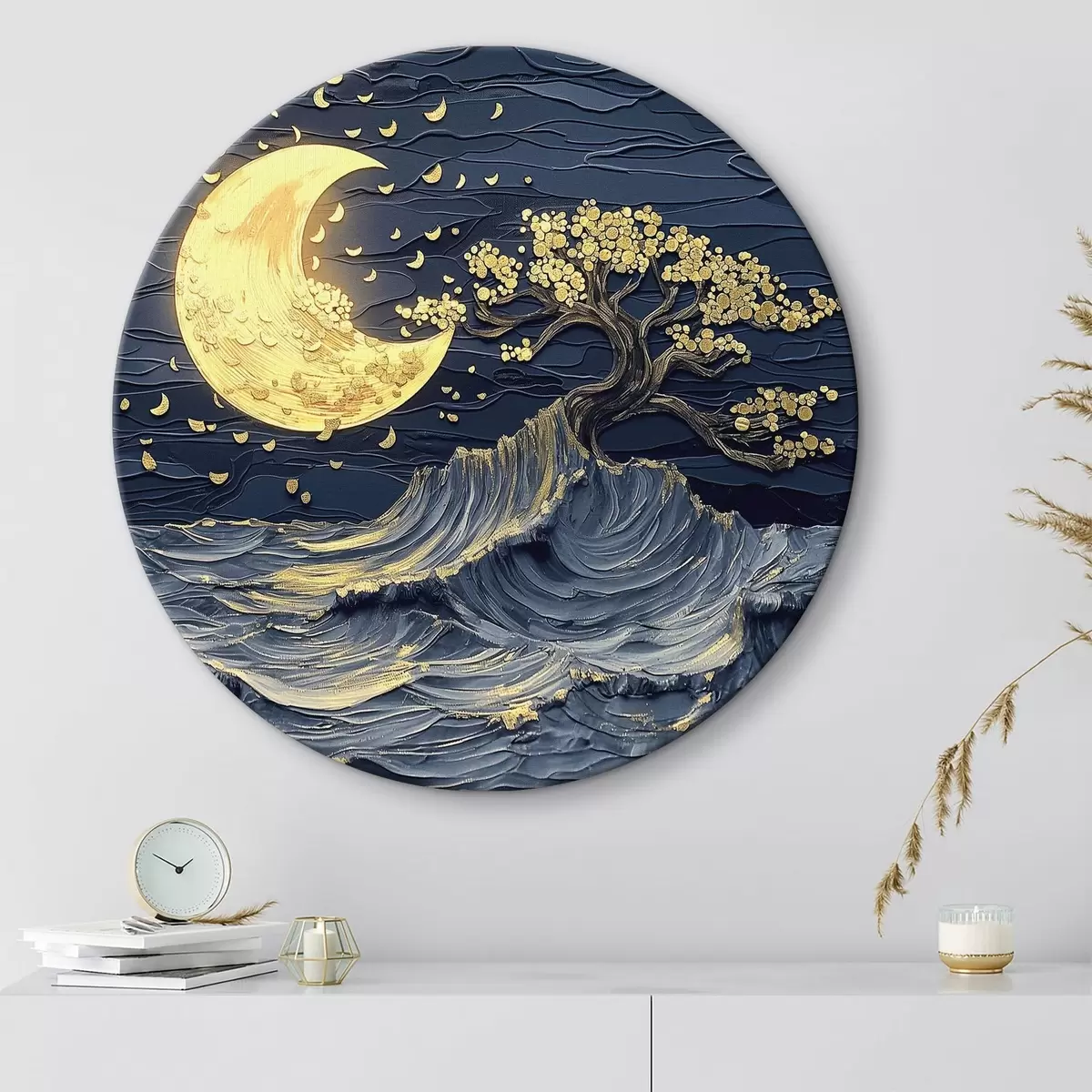 Tableaux rondes Peinture acrylique : paysages marins romantiques avec feuilles mortes et reflets de lune r39449