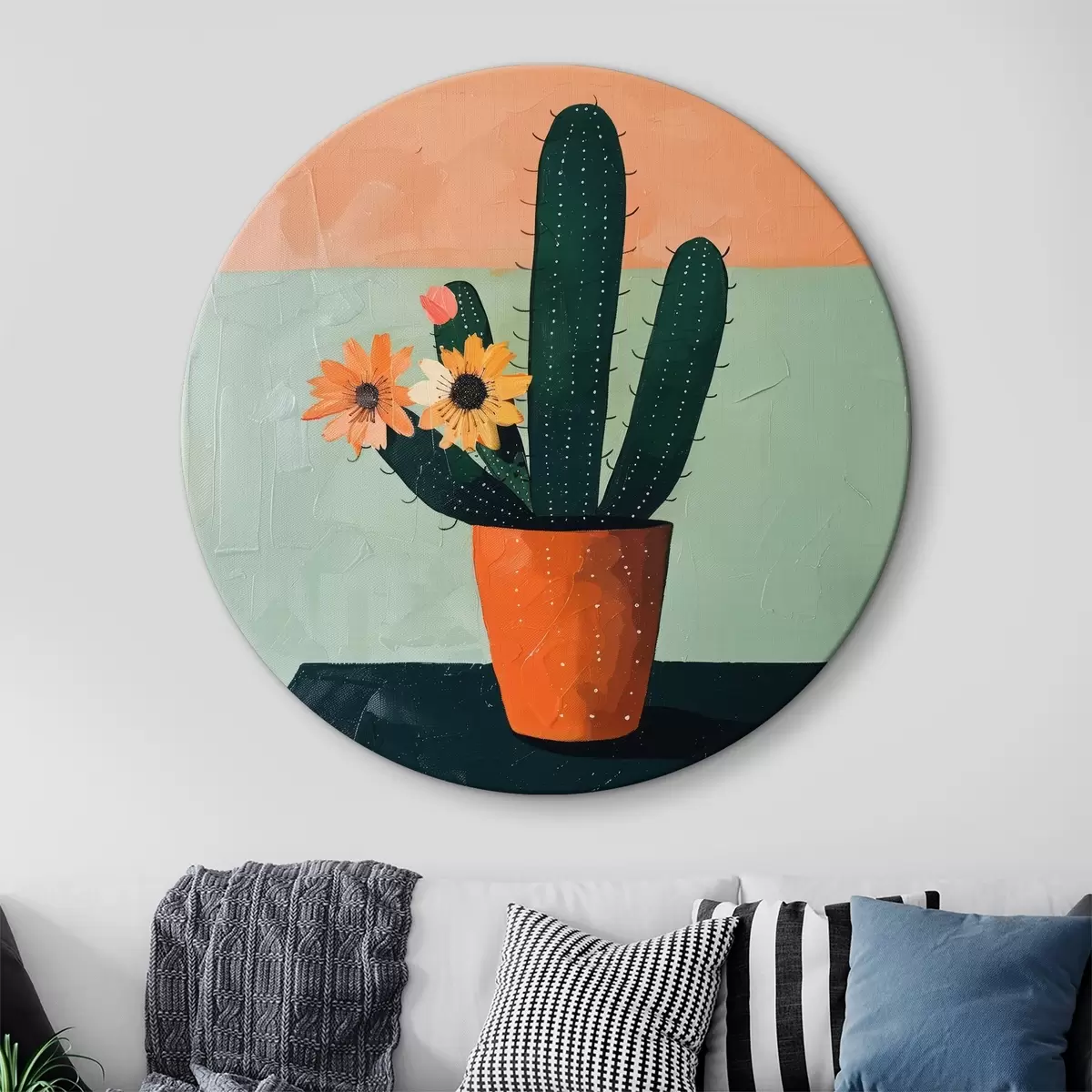 Tableaux rondes Une peinture minimaliste d’un seul cactus avec des fleurs dans une palette de couleurs audacieuses. Nr r39452