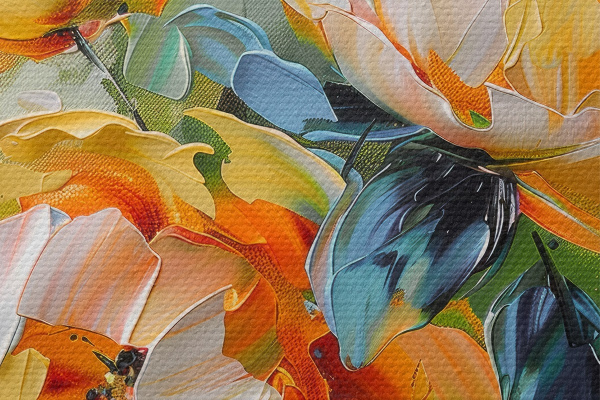 Trois types de matériaux peuvent être commandés : Economic Canvas - matériau dense et durable pour l'impression numérique, identique à la toile de peintre, surface imperméable, reproduction réaliste des détails, matériau à grain moyen. Premium Canvas - la texture ressemble à celle d'une toile de peintre (petits fils entrelacés). Reproduction douce et détaillée de l'image sur une surface mate. Eco-Premium - tissu 100 % coton de haute qualité. Grâce aux fibres naturelles de coton, le matériau est durable et résistant à l'usure. Excellente reproduction des couleurs et des détails.