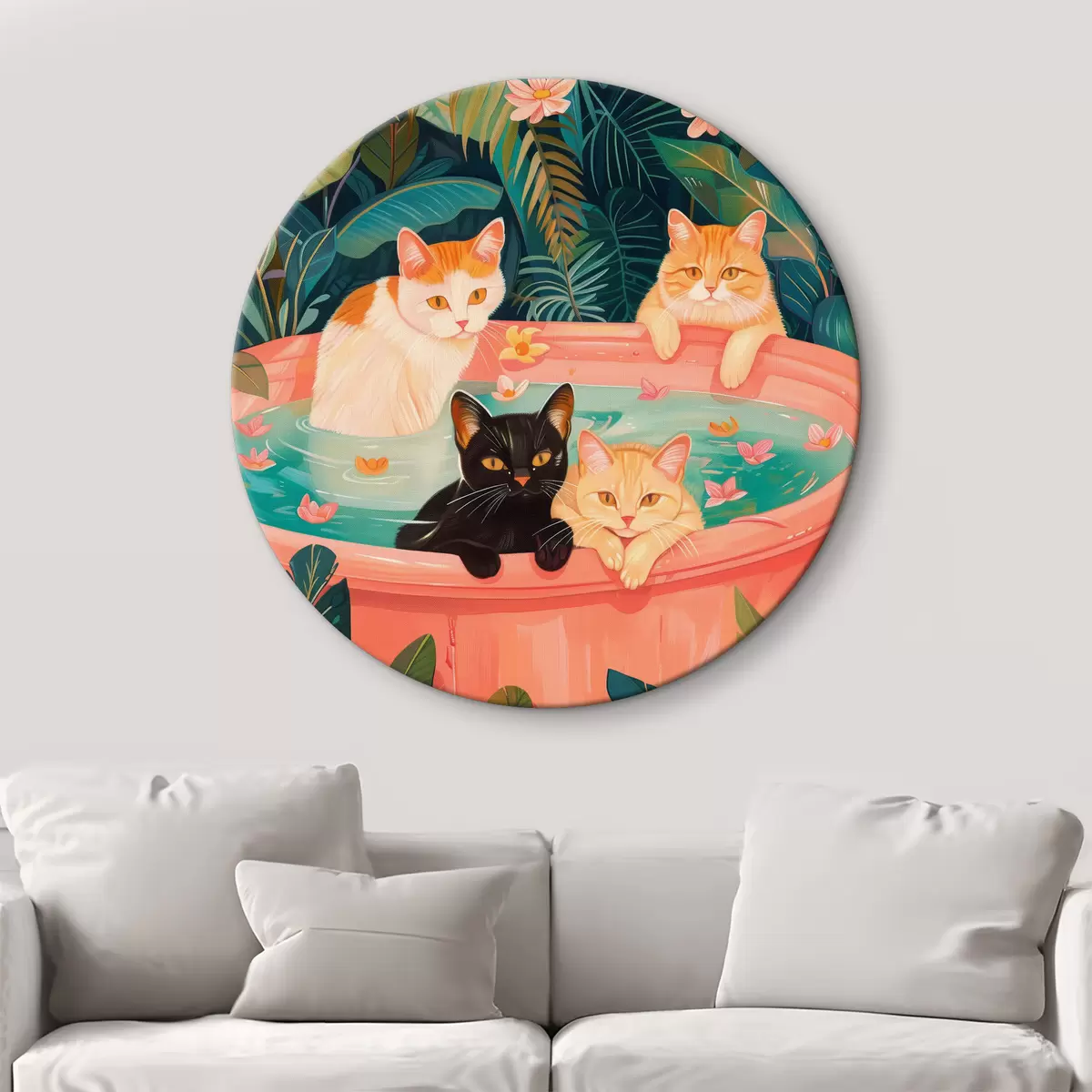 Tableaux rondes Chats dans un bain rose aux feuilles vertes, ambiance jungle Nr r39465