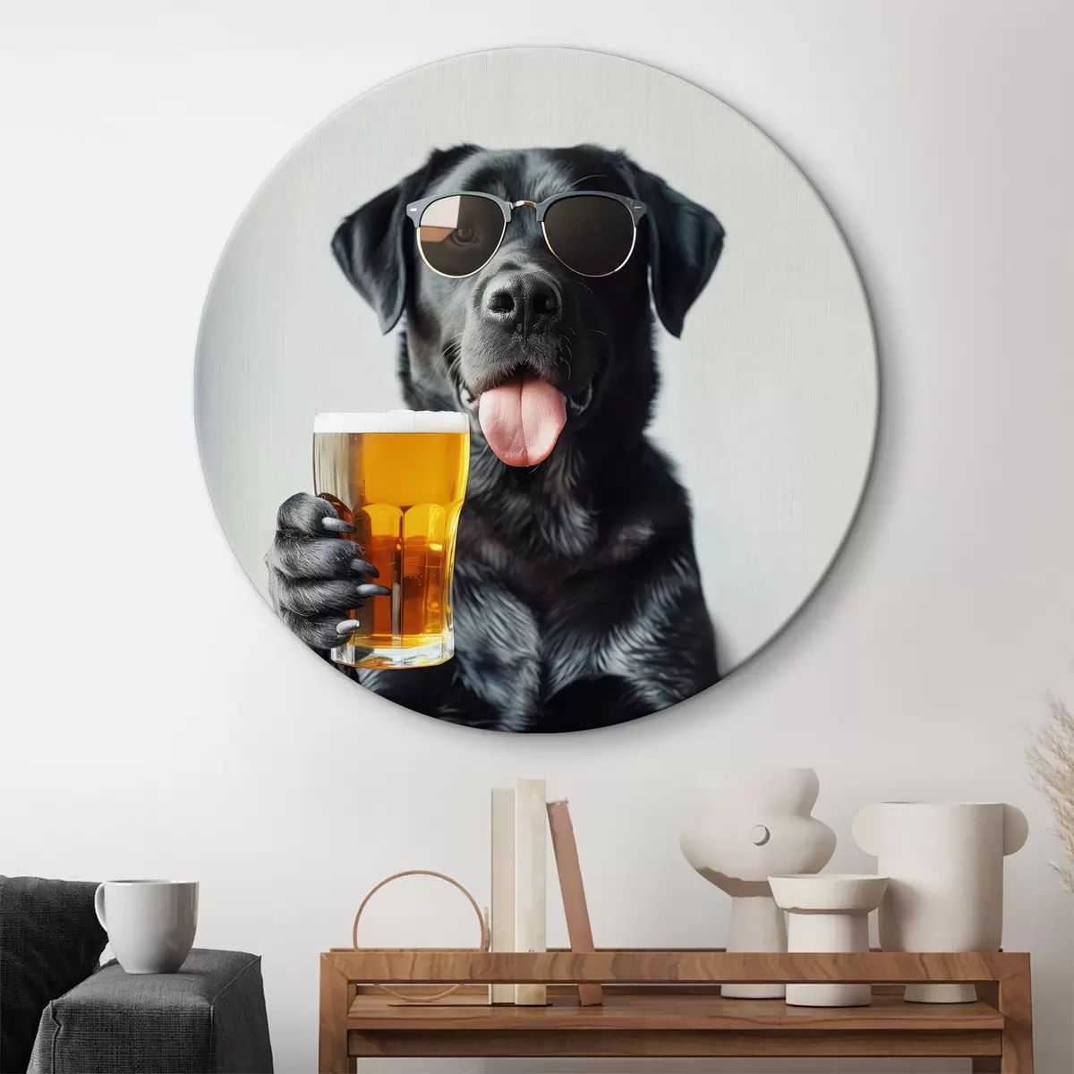 Tableaux rondes Portrait d'un labrador noir portant des lunettes de soleil et tenant une pinte de bière, regardant directement la caméra Nr r39470