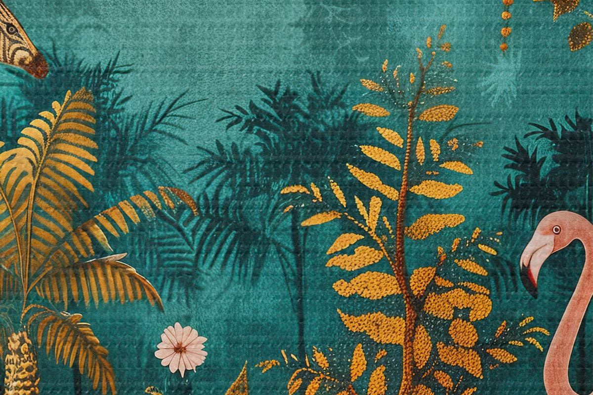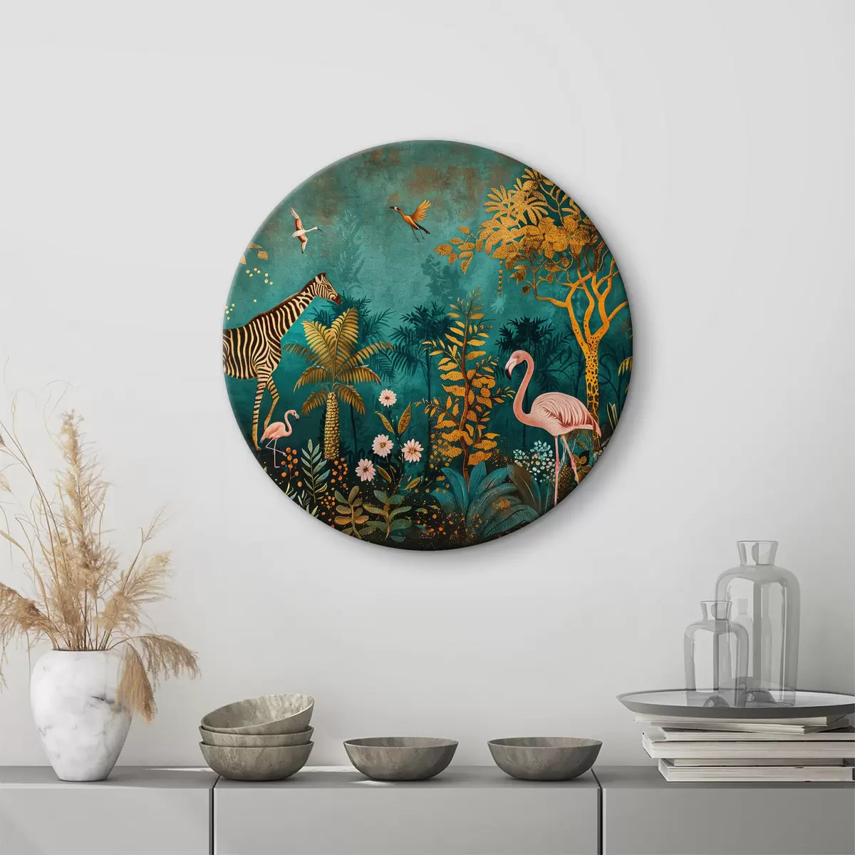 Tableaux rondes Safari enchanté : une illustration vintage avec des zèbres, des flamants roses, des oiseaux dans des tons doux de vert mousse, bleu et rose Nr r39471