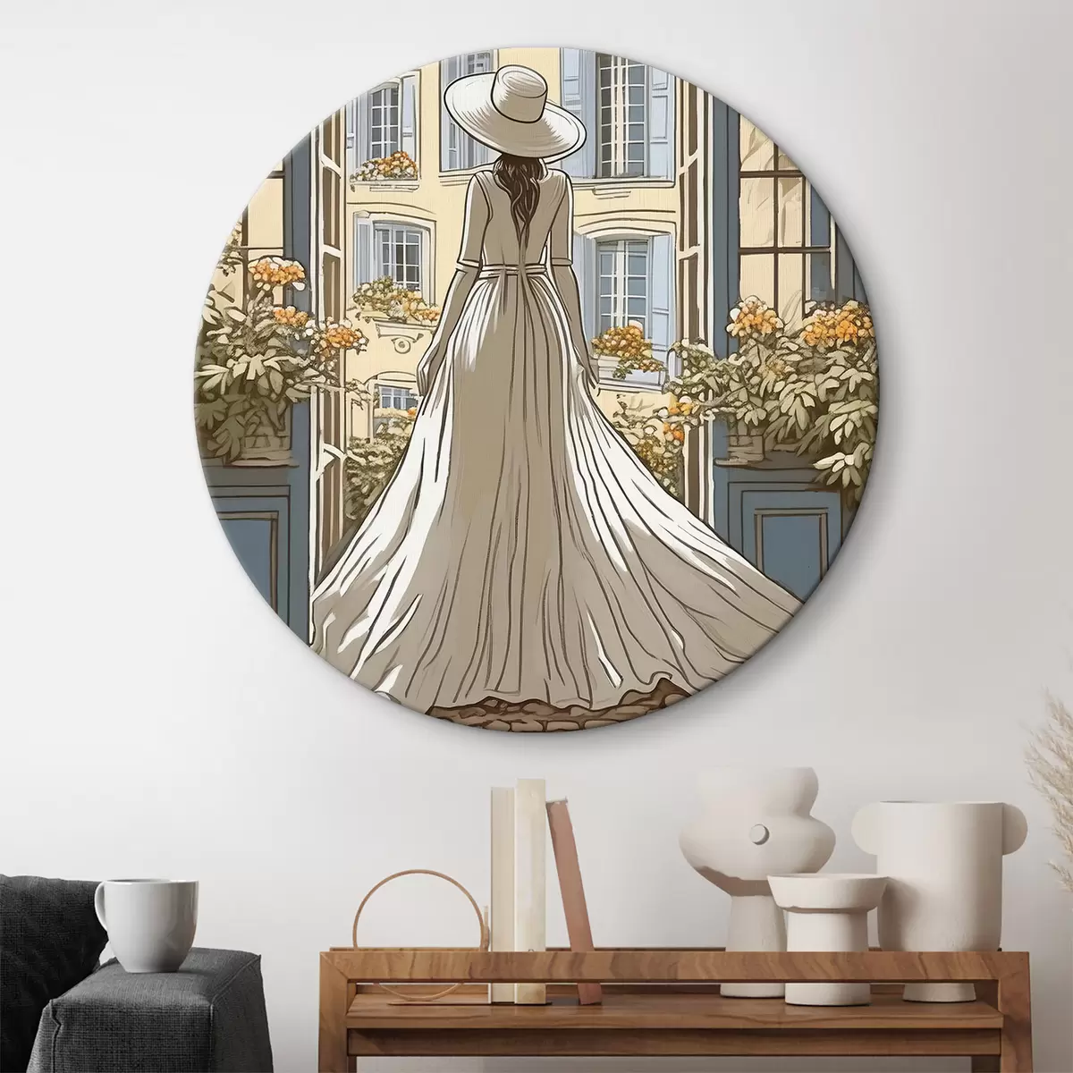 Tableaux rondes silhouette d'une jeune fille vêtue d'une robe blanche près de la fenêtre Nr r39479
