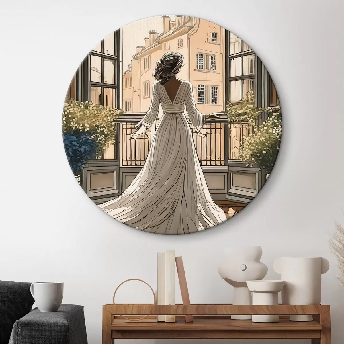 Tableaux rondes silhouette d'une jeune fille vêtue d'une robe blanche près d'une grande fenêtre r39480