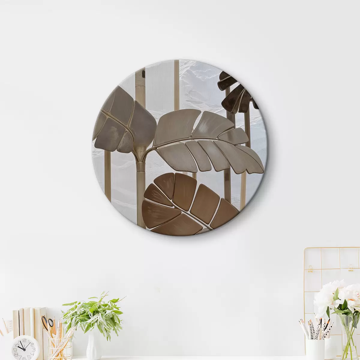 Tableaux rondes Une vue rapprochée de feuilles ou de frondes de palmier abstraites composées de différentes nuances de tons bruns et beiges Nr r39499