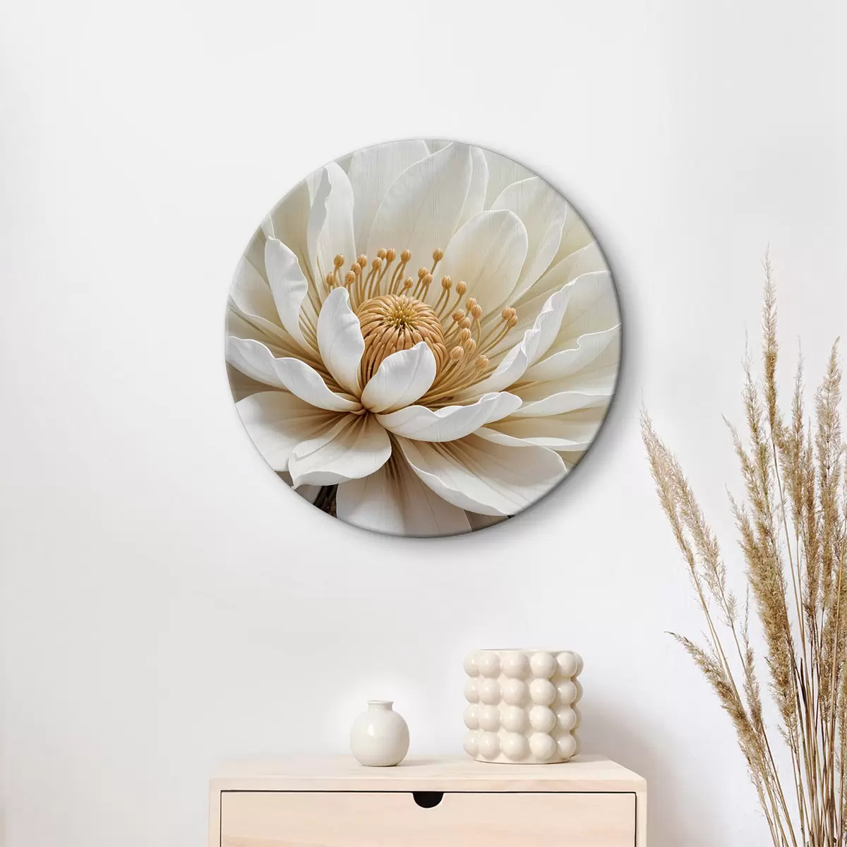 Tableaux rondes Gros plan d'une grande fleur de dahlia blanche aux pétales délicats et au centre jaune vif Nr r39508