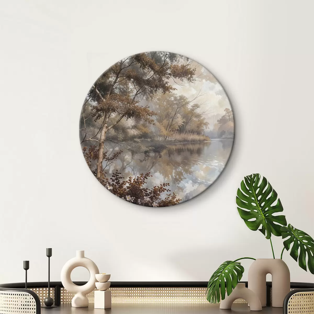 Tableaux rondes Paysage d'automne avec un lac calme entouré d'arbres au feuillage orange et jaune vif Nr r39511