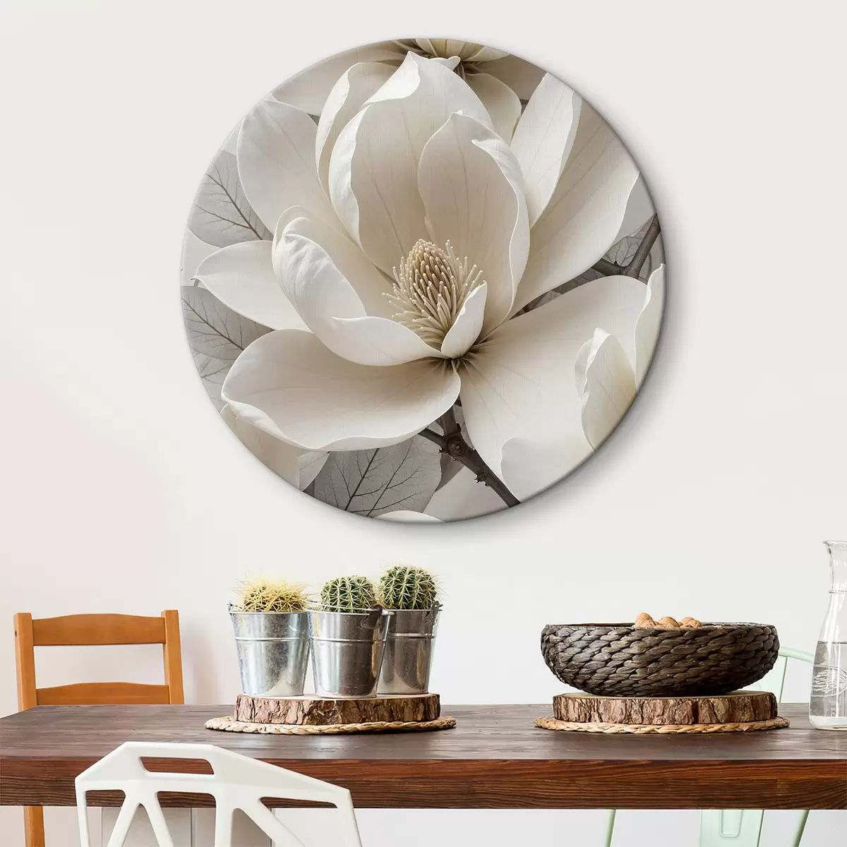 Tableaux rondes Fleur de magnolia blanche aux pétales délicats entourée de feuilles vertes sur fond clair Nr r39527