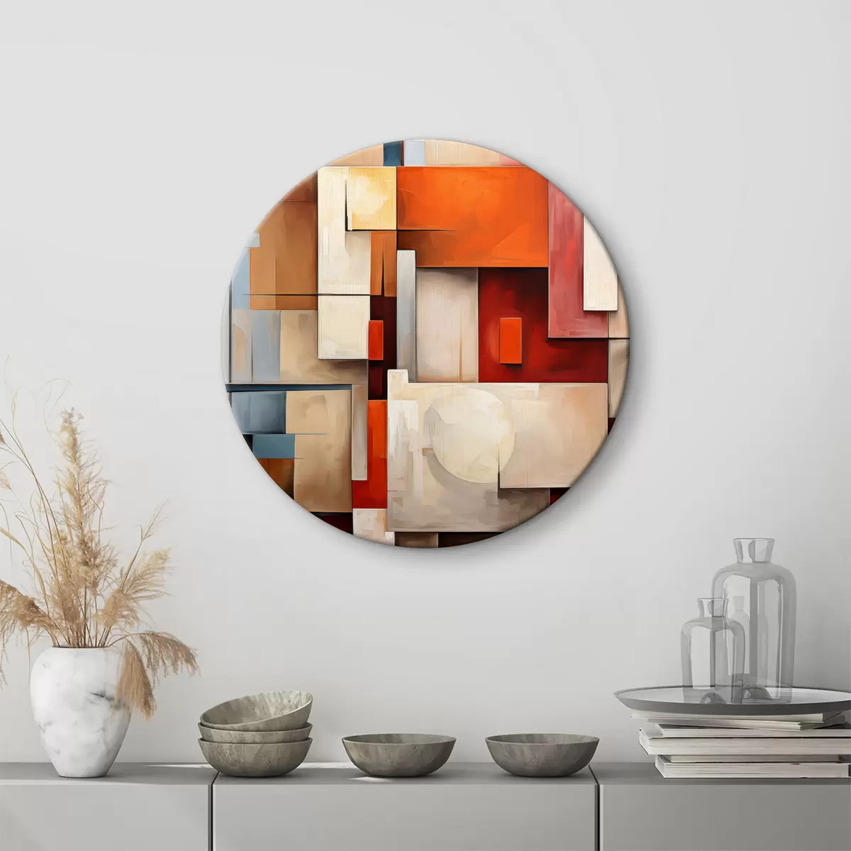 Tableaux rondes Abstraction dans le style cubisme, peinture à l'huile, couleurs rouge, bleu, blanc Nr r39571