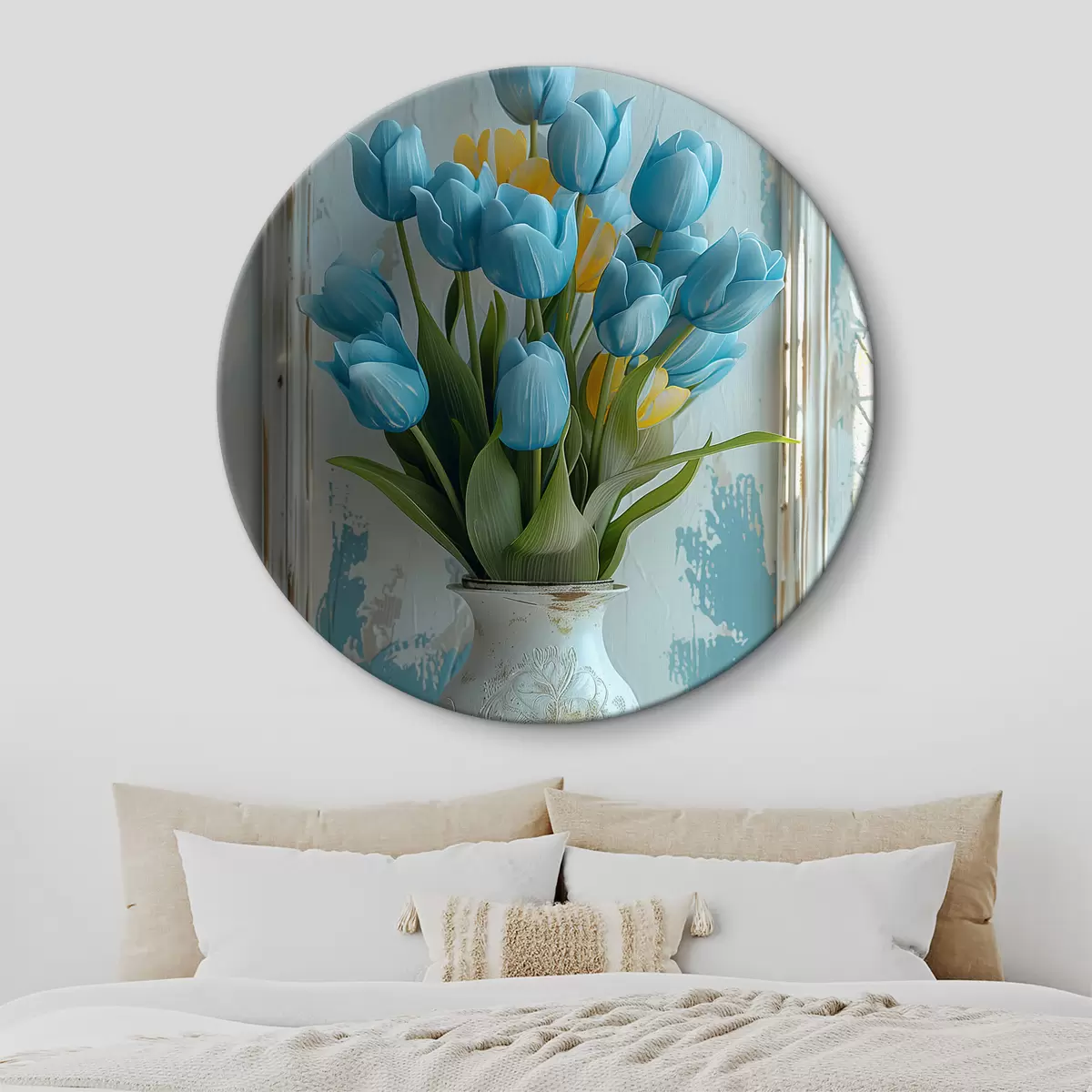 Tableaux rondes Tulipes bleues et jaunes en 3D : tableau mural élégant avec cadre blanc, fond blanc et bleu clair et vase gravé r39636