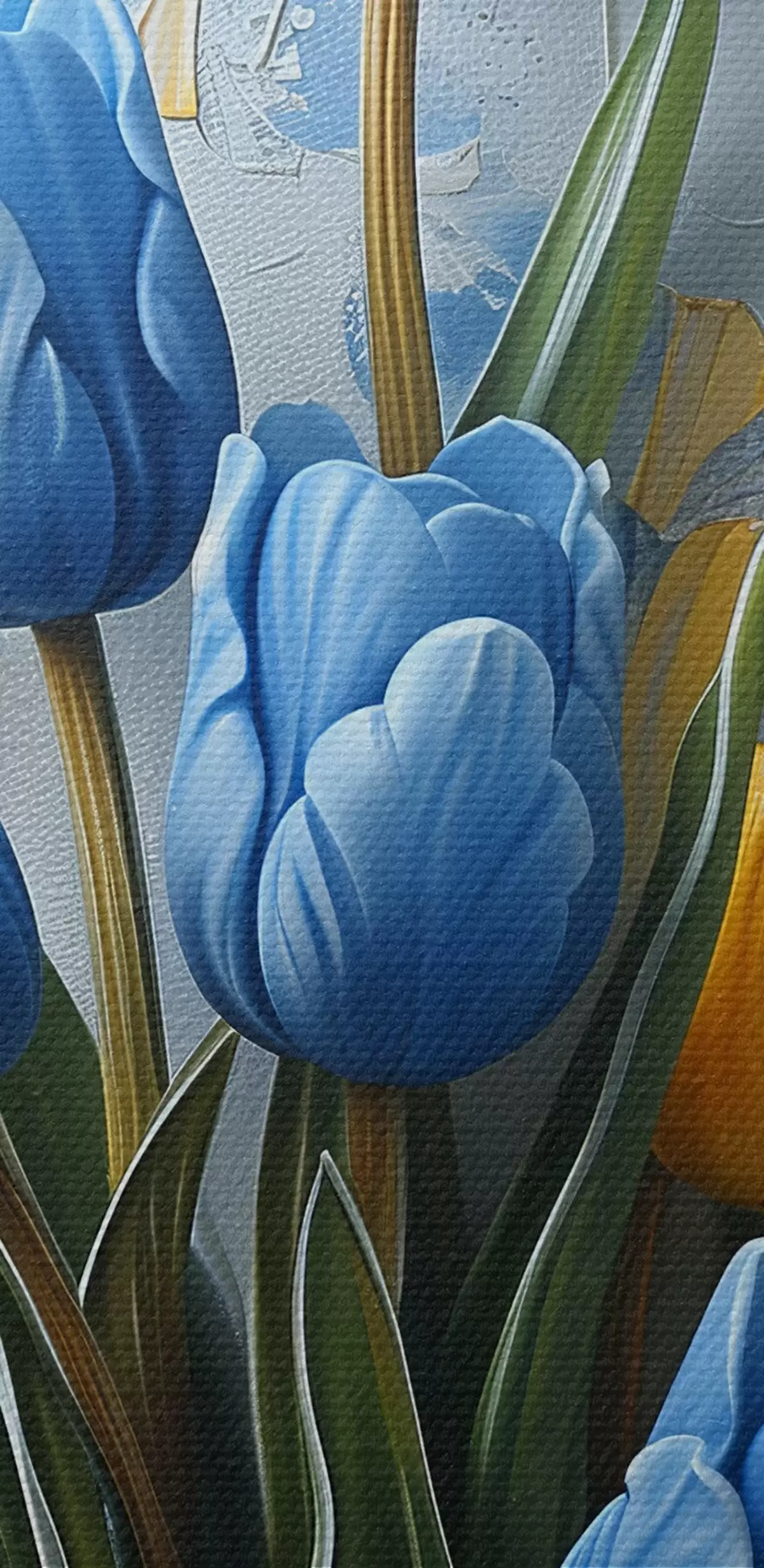Tableaux rondes Tulipes bleues et jaunes en 3D : élégante peinture murale à l'huile avec fond blanc et bleu clair et vase gravé r39637