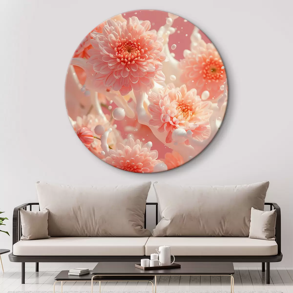 Tableaux rondes Chrysanthèmes roses avec des éclaboussures de lait sur fond rose tendre : une composition florale r39643