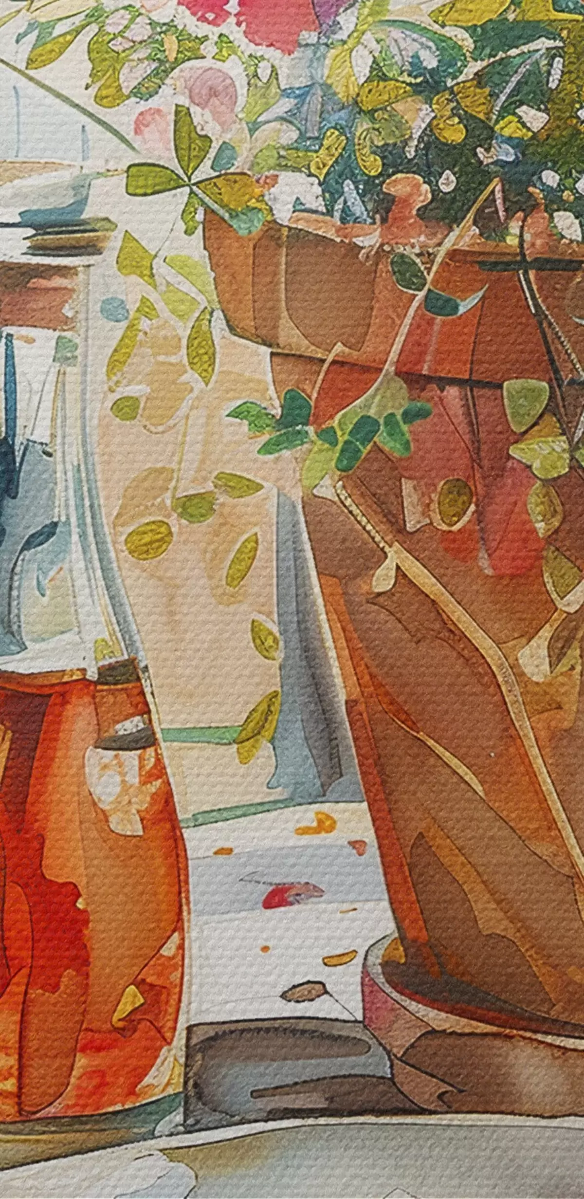 Tableaux rondes Branche aquarelle avec risotto, soleil dans la fenêtre, verre de cocktail, pot de fleurs Nr r39706