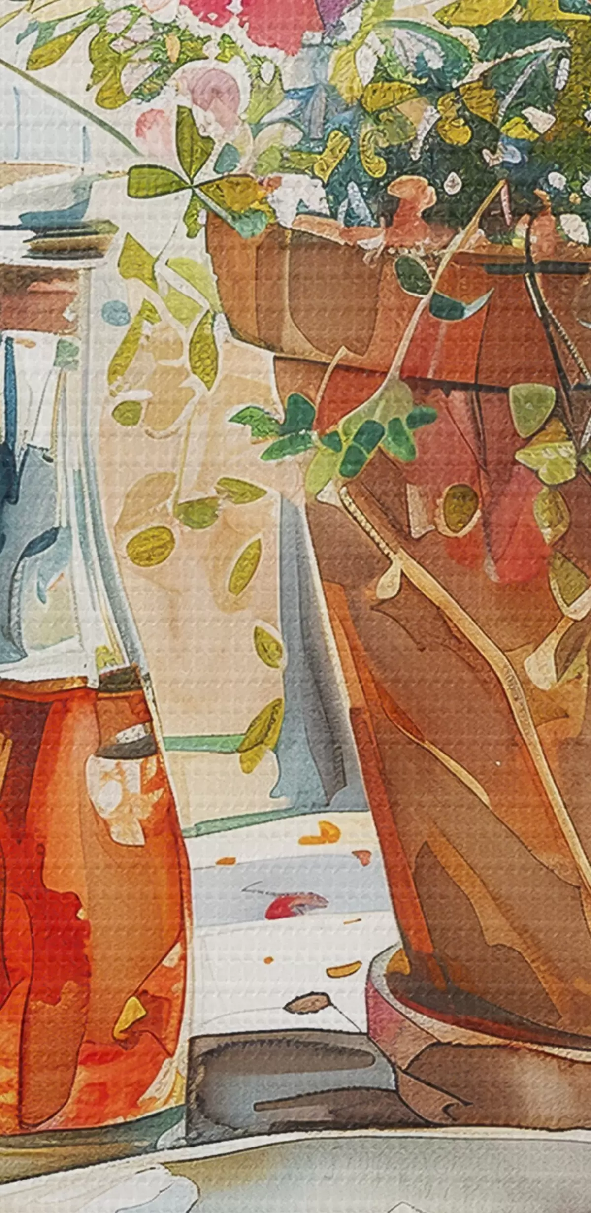 Tableaux rondes Branche aquarelle avec risotto, soleil dans la fenêtre, verre de cocktail, pot de fleurs r39706
