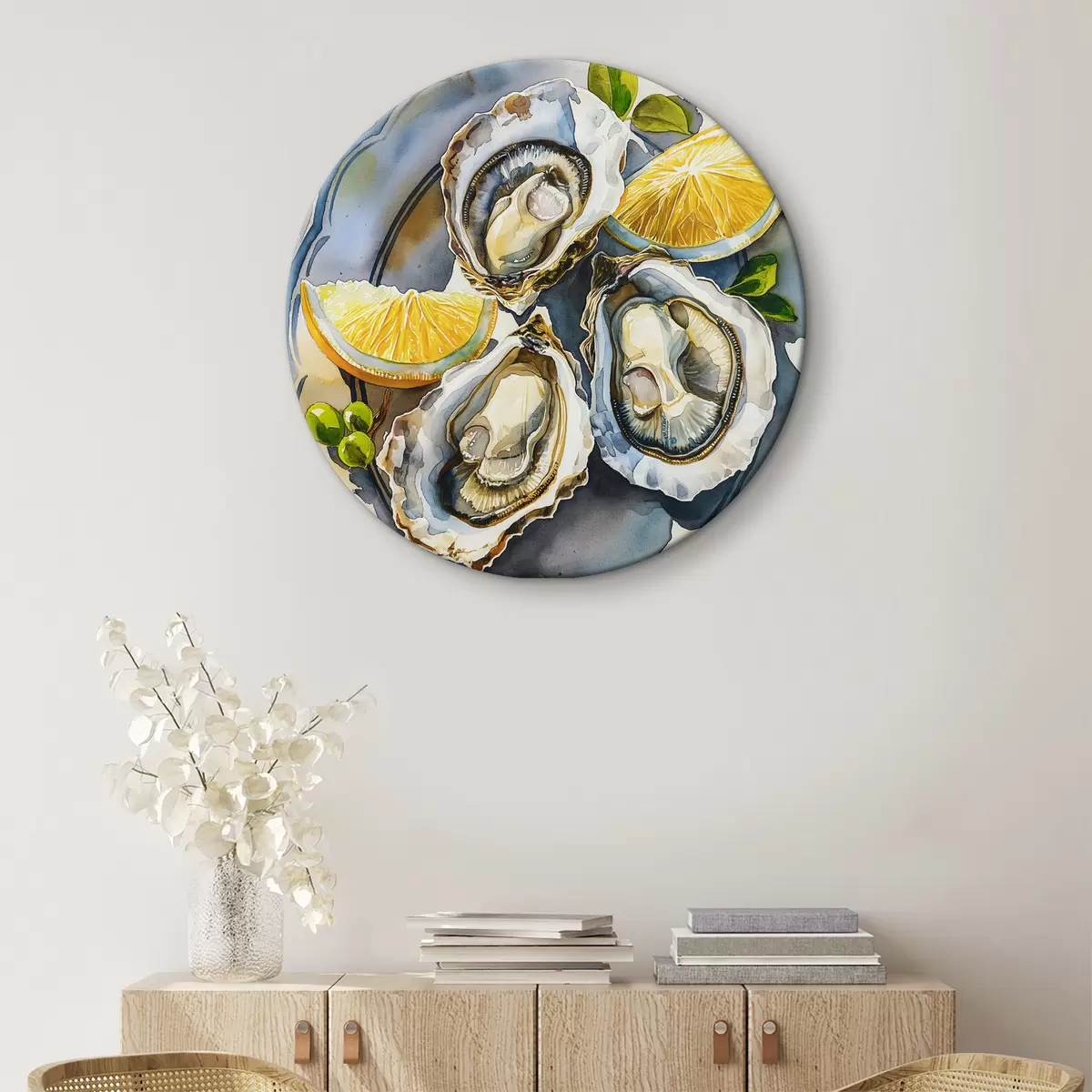 Tableaux rondes Huîtres élégantes dans l'assiette, aquarelle, citrons, couleurs naturelles, méditerranéennes r39711
