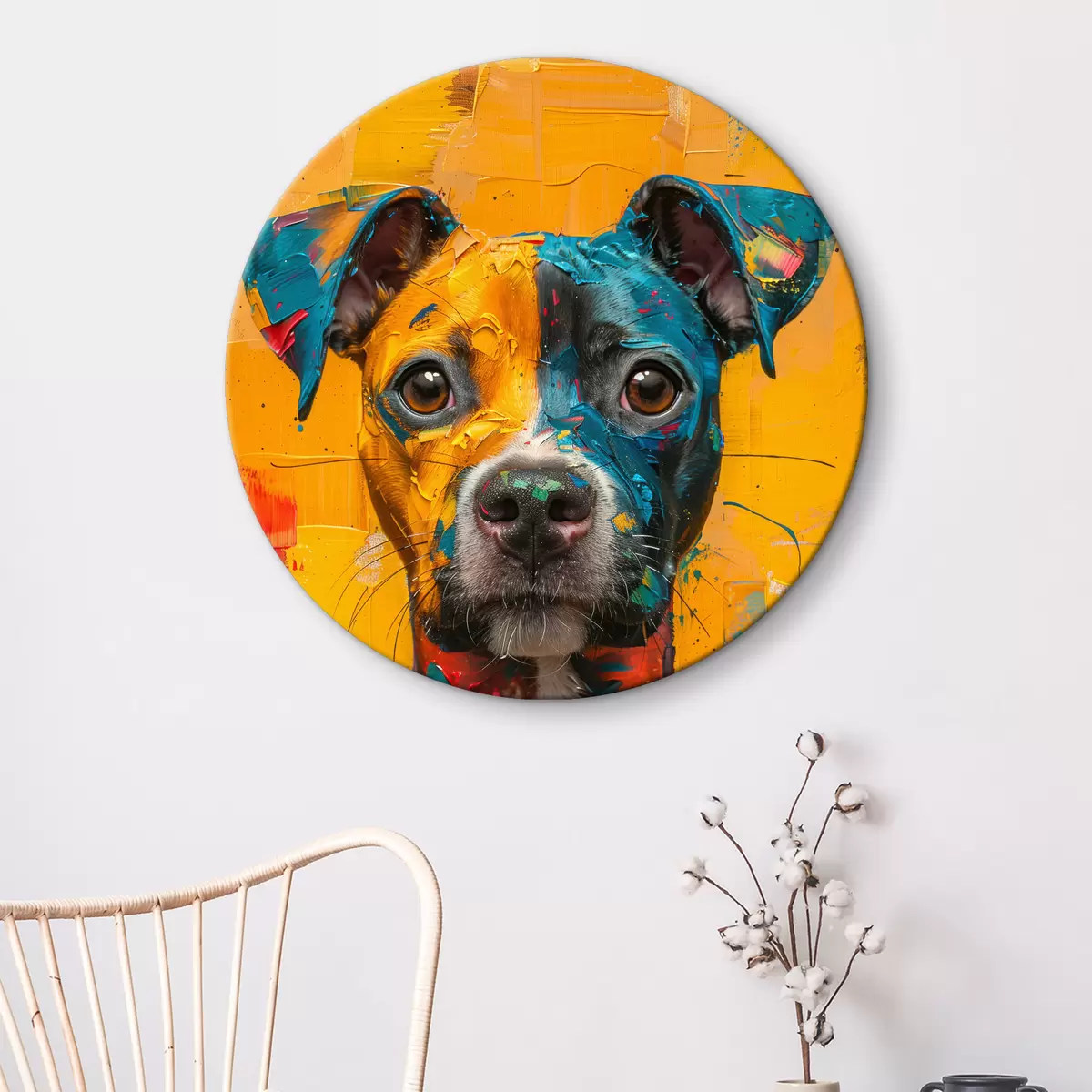 Tableaux rondes Portrait d'un Pitbull avec des coups de pinceau à huile jaune et bleu Nr r39722