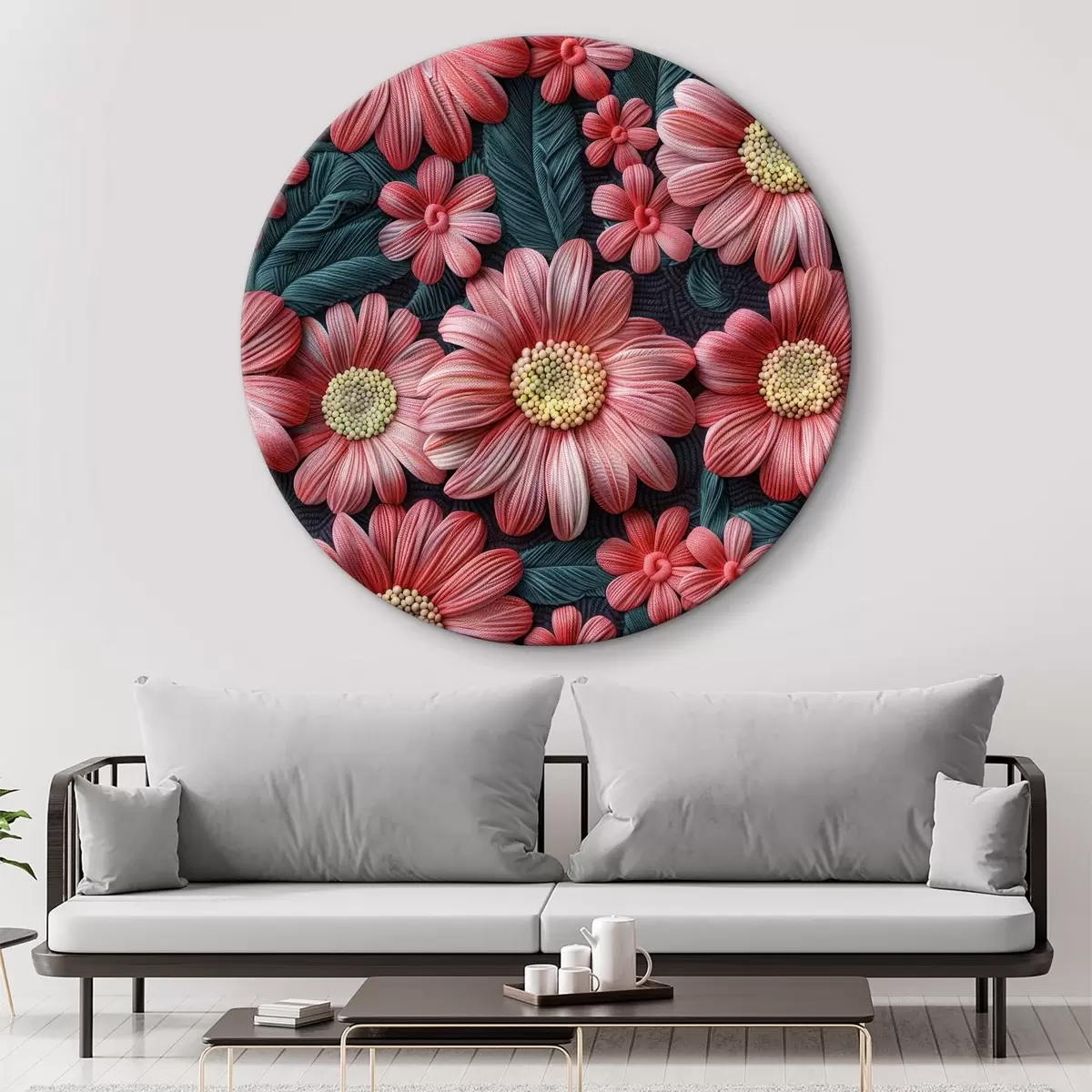 Tableaux rondes Broderie 3D de gerberas roses à partir de fil de laine sur fond matelassé Nr r39746