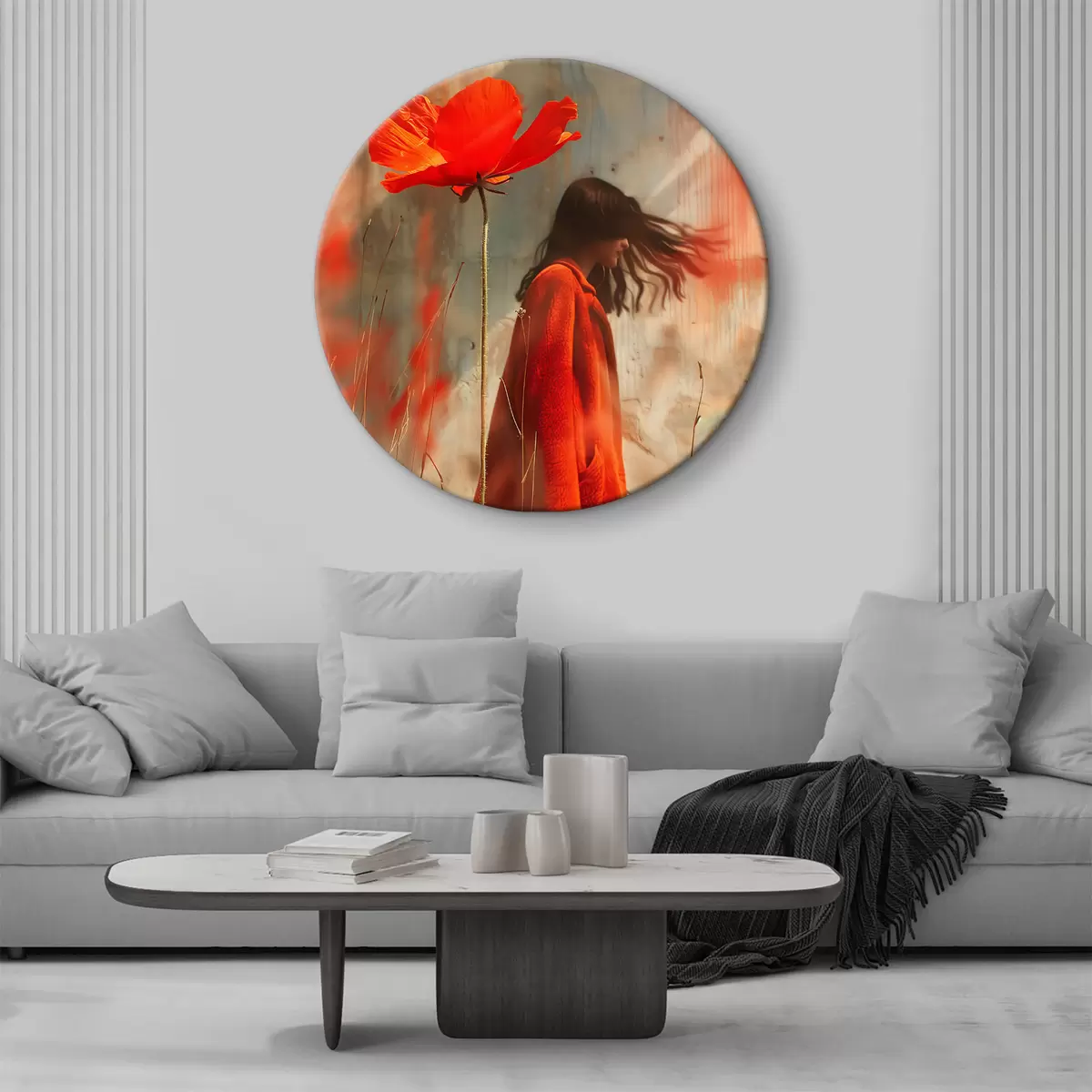 Tableaux rondes Fille dans un manteau de fourrure rouge avec un coquelicot poussant dans le champ Nr r39764