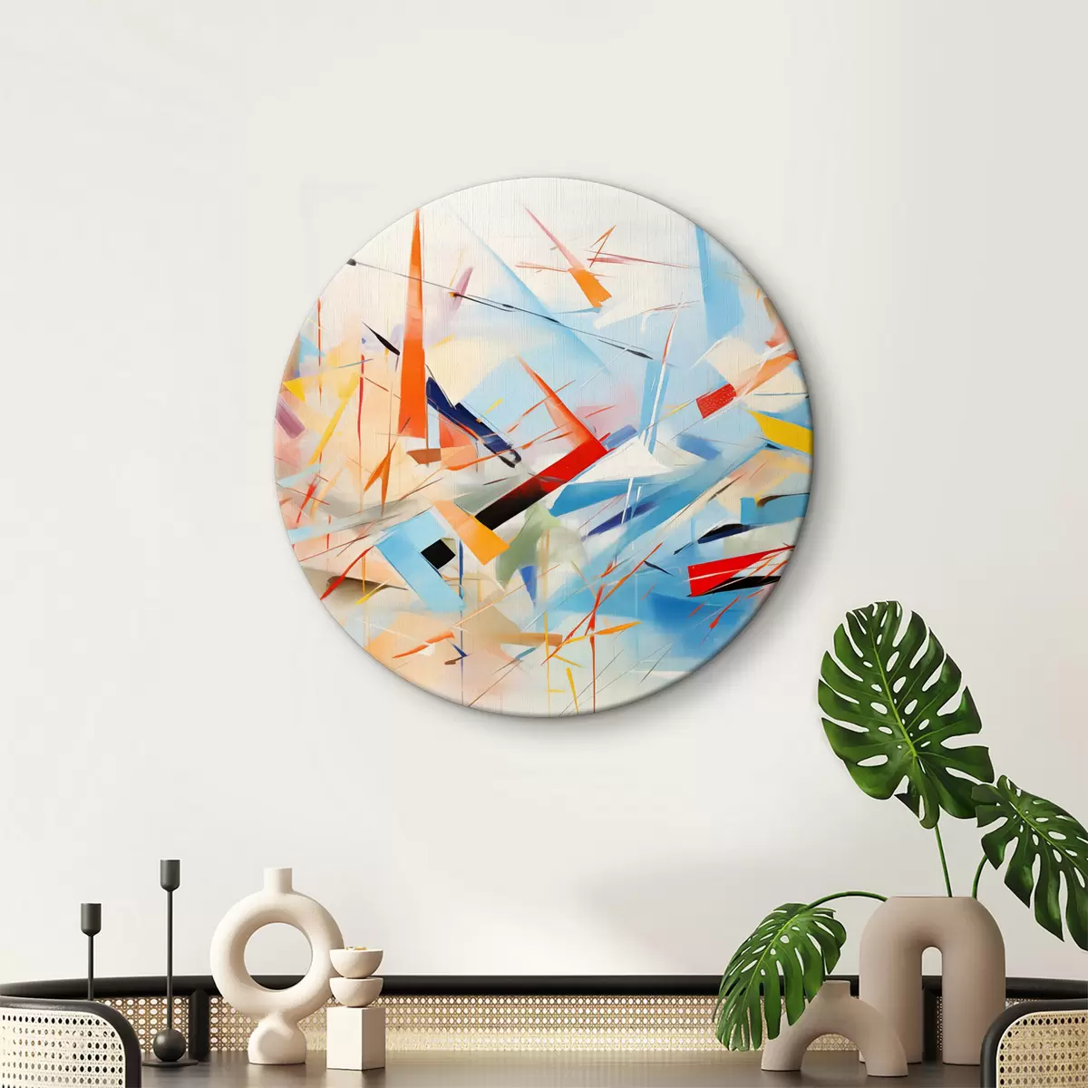 Tableaux rondes Abstraction géométrique dynamique chaotique, bleu, rouge, jaune r39813