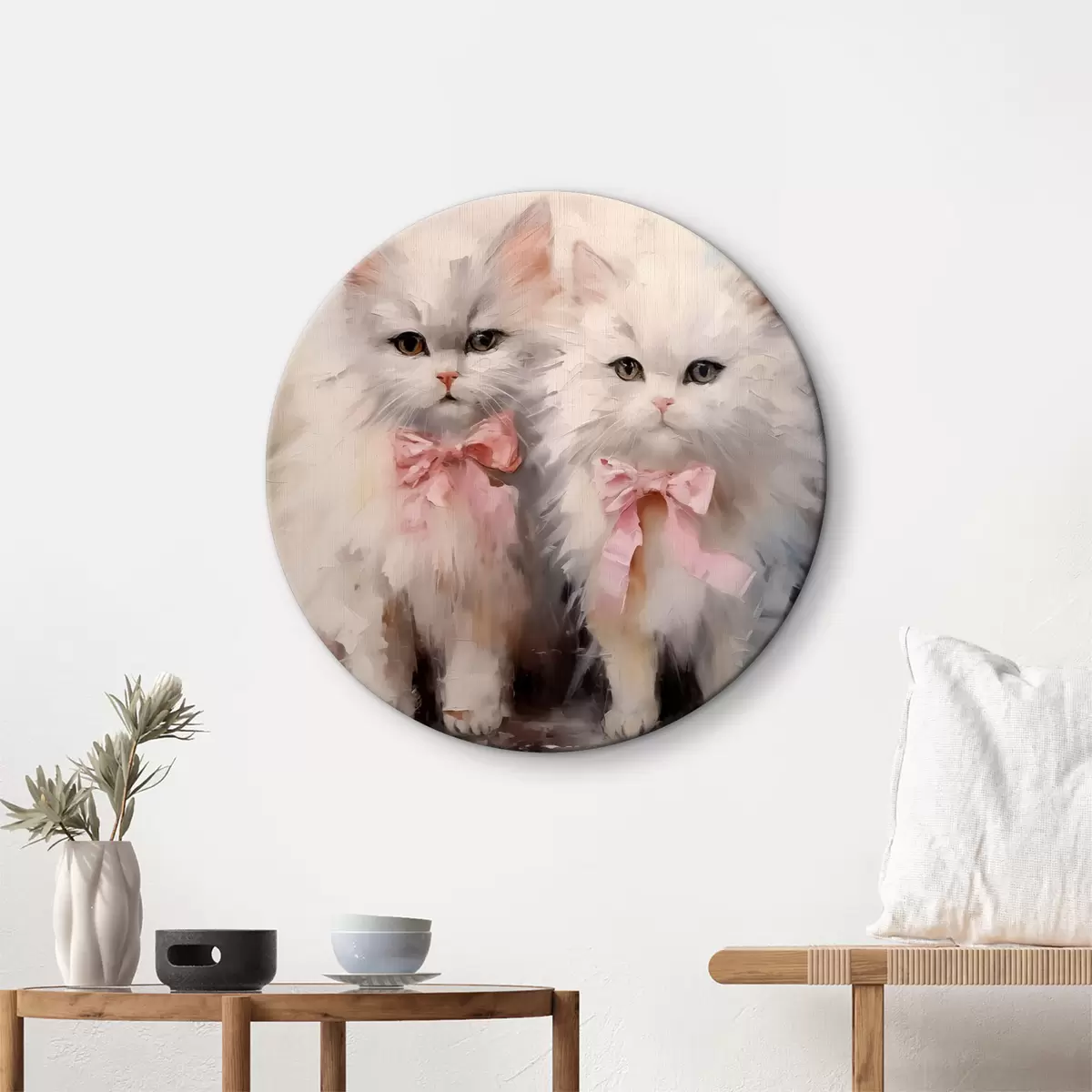 Tableaux rondes Chats blancs avec peinture à l'huile d'arcs roses r39826