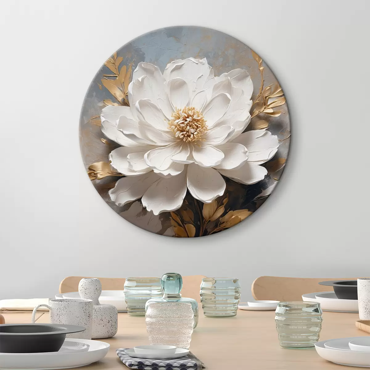 Tableaux rondes Fleur blanche avec tiges sur fond abstrait Nr r39865
